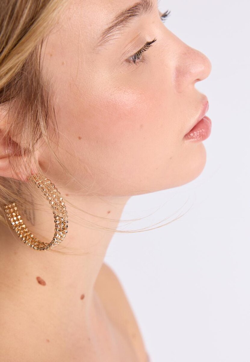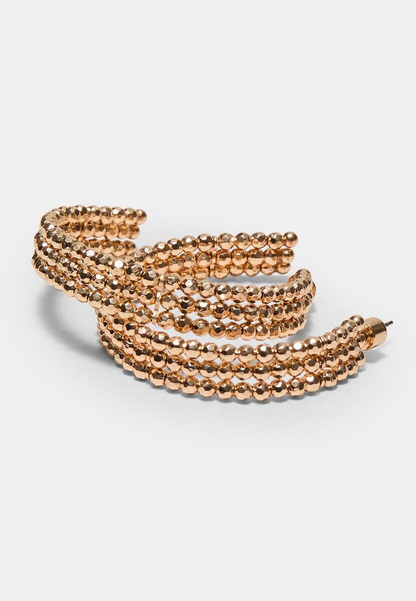 Boucles d’oreilles créoles rigides. La surface du cerceau est décorée de petites perles en relief sur toute la longueur. Fermeture à pression.