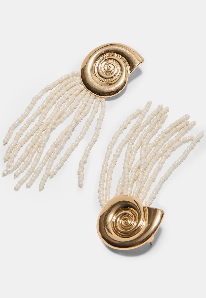 Boucles d’oreilles pendantes. Avec une partie supérieure en forme de coquillage et une cascade de perles.