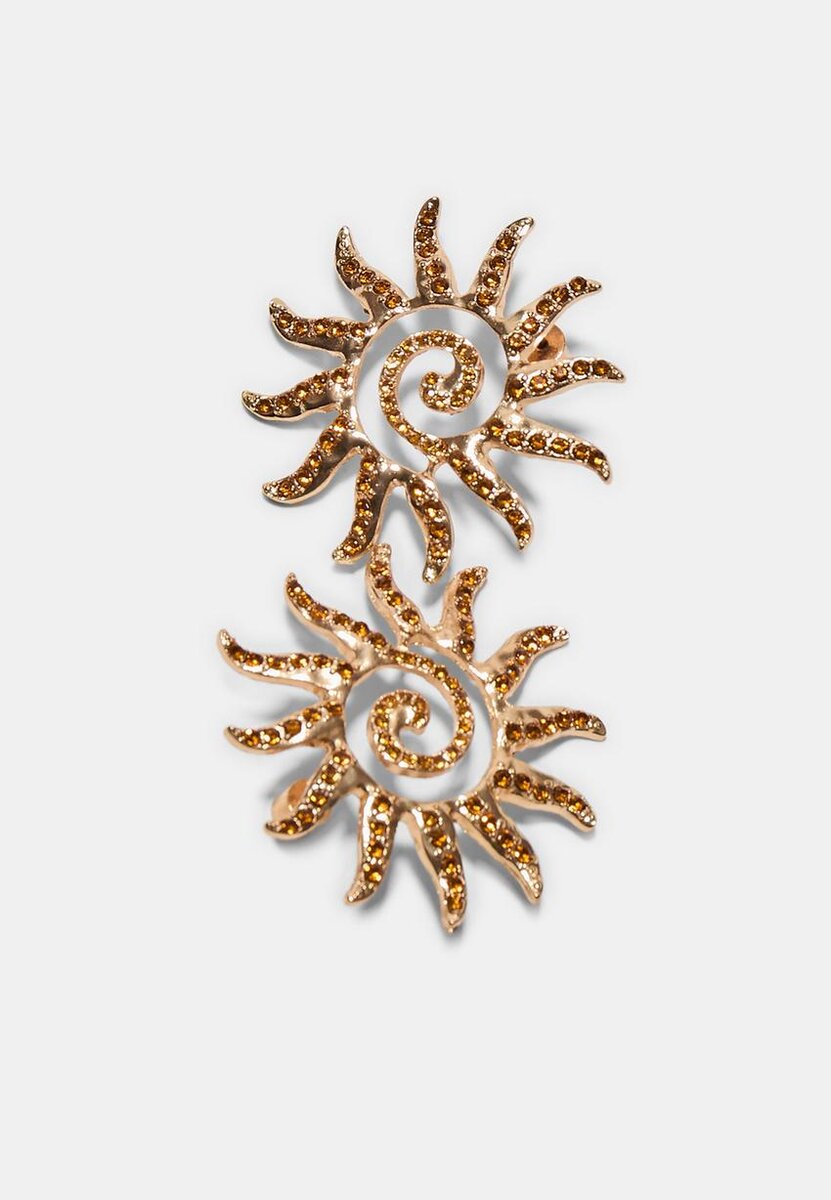 Petites boucles d’oreilles au motif soleil. Hauts texturés avec des rayons partant d’un centre en spirale. Strass appliqués au centre et sur les rayons. Fermeture à pression.