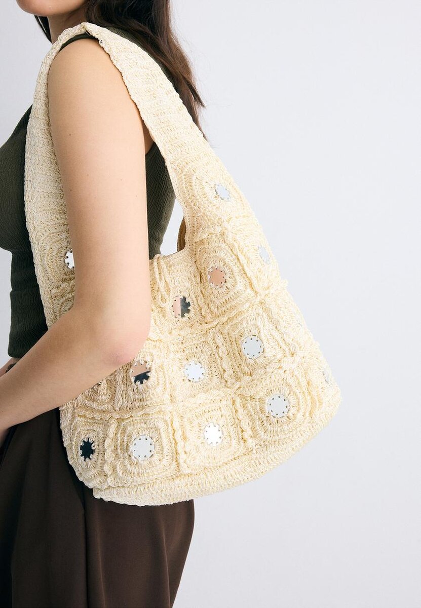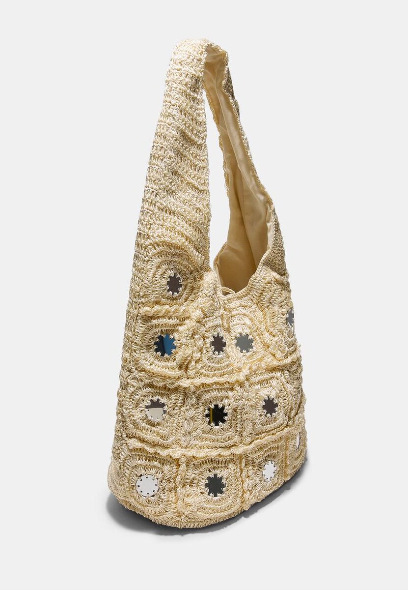 Sac à bandoulière avec ornements en miroir. Bandoulière. Doublure intérieure. Disponible en plusieurs couleurs.