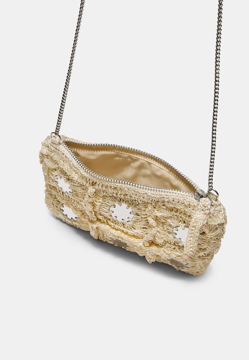 Sac à bandoulière en tissu crocheté avec détails miroir. Doté d’une bandoulière en chaîne et d’une fermeture à glissière. Intérieur doublé. Disponible en plusieurs couleurs.
