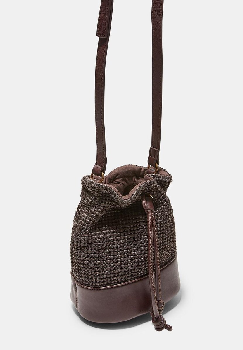 Style sac seau. Motif rayé. Fermeture froncée réglable. Bandoulière. Disponible en plusieurs couleurs.