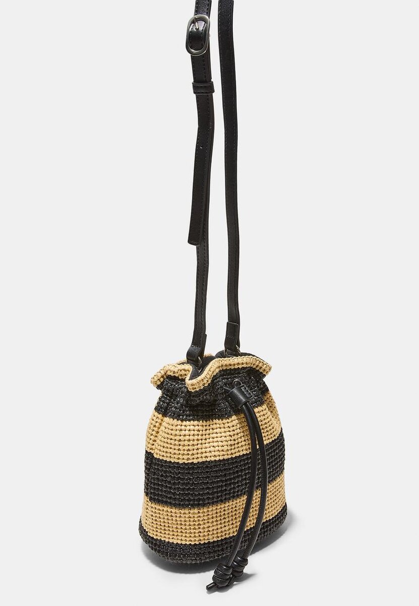 Sac seau. Motif rayé. Fermeture à cordon réglable. Bandoulière. Disponible en plusieurs couleurs.