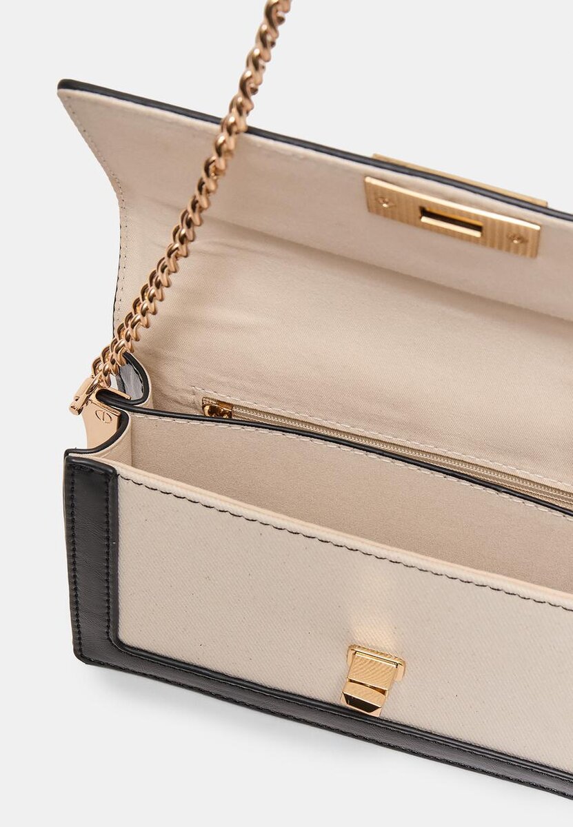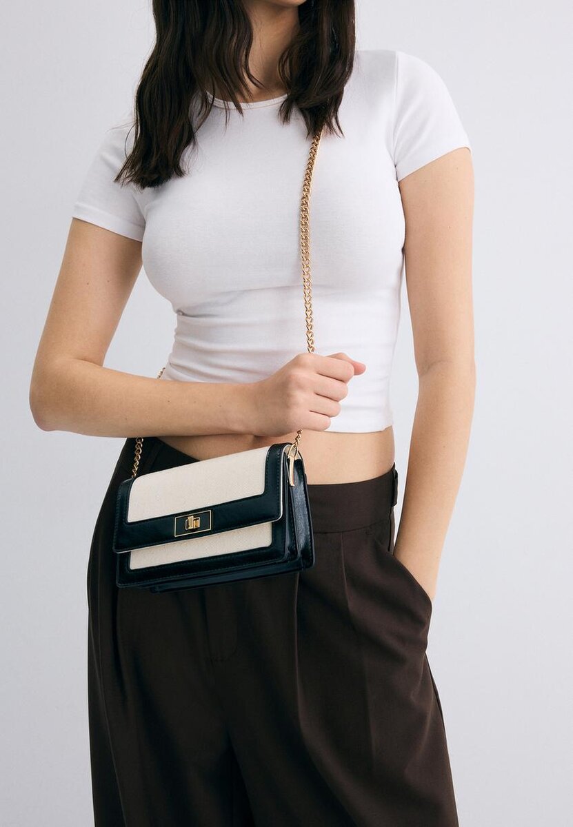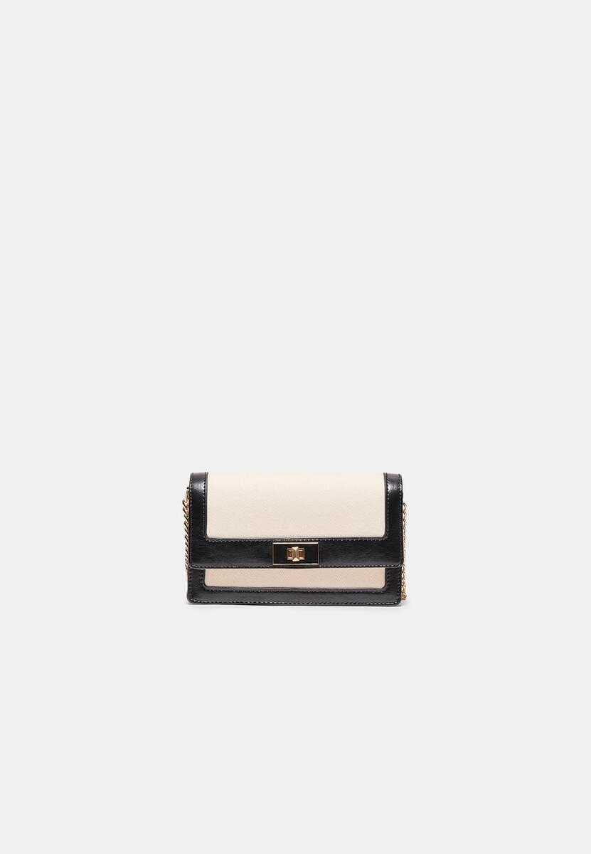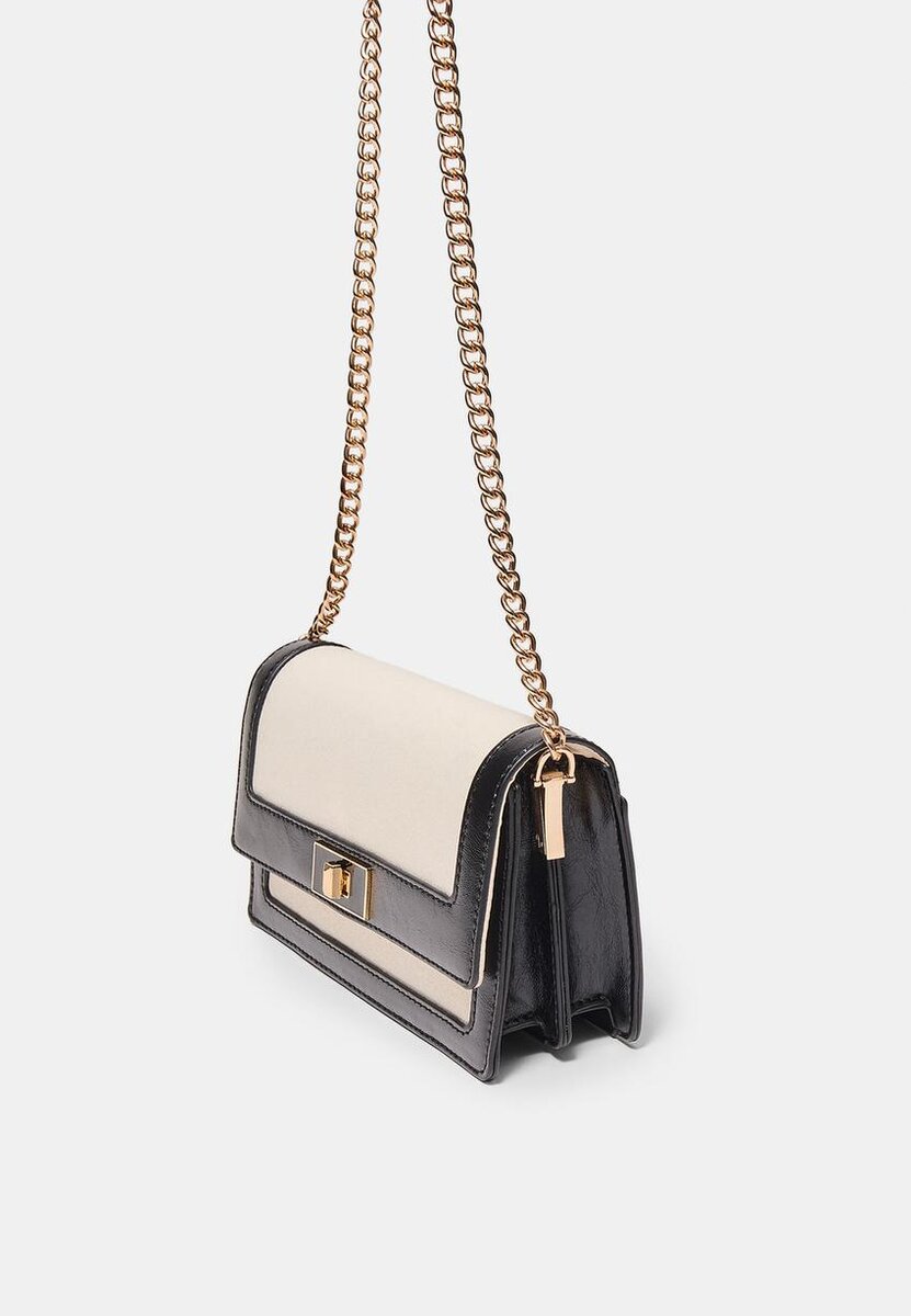 Sac à bandoulière contrasté. Fermoir métallique sur le rabat. Bandoulière à chaîne. Fabriqué à partir d’un tissu principal en coton. Disponible en plusieurs couleurs.