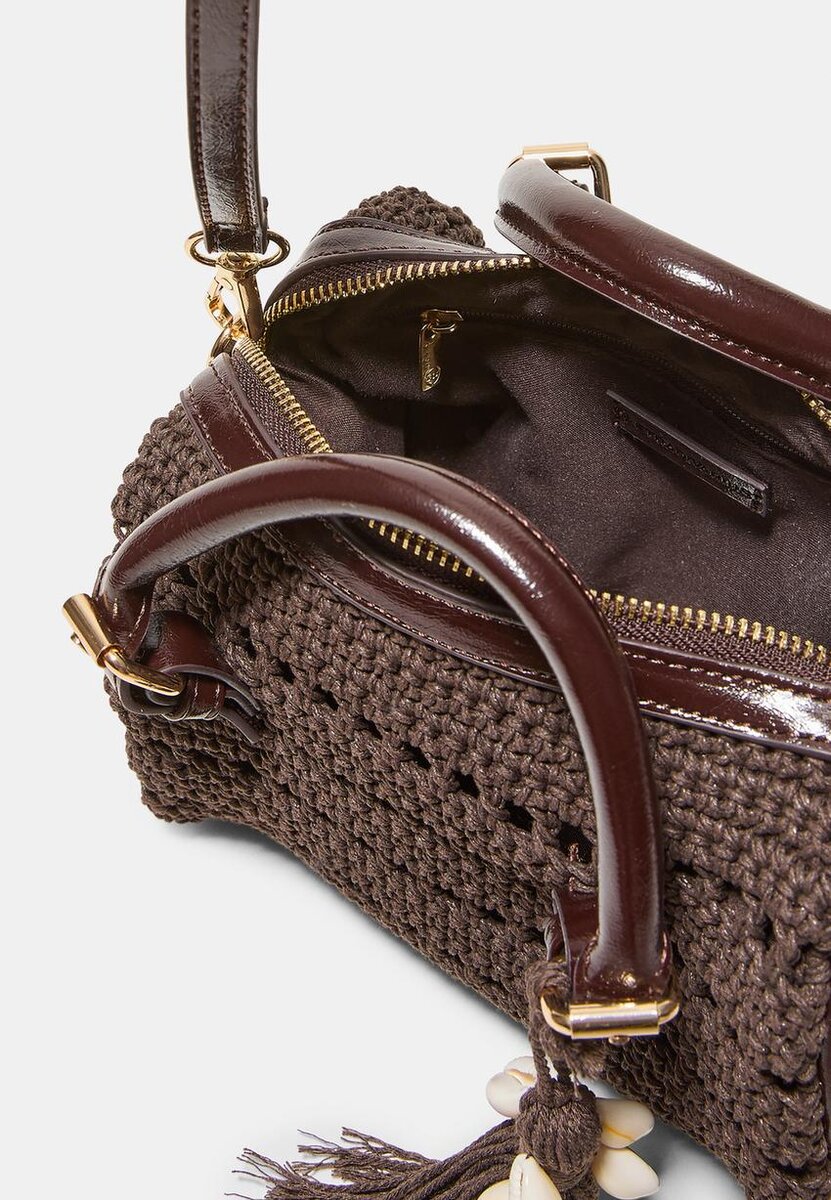 Sac cabas en crochet de coton avec deux anses et une bandoulière amovible. Fermeture à glissière. Orné d’un détail de perles et de coquillages. Disponible en plusieurs couleurs.