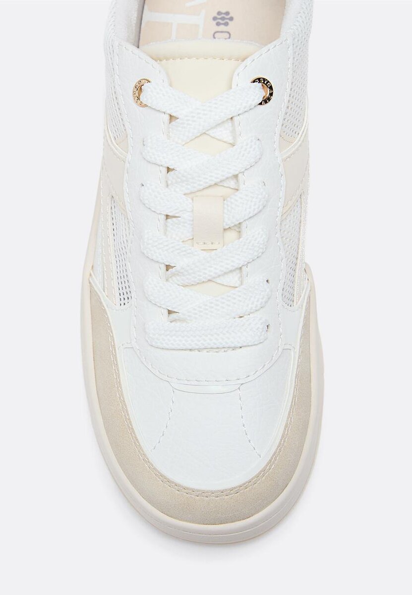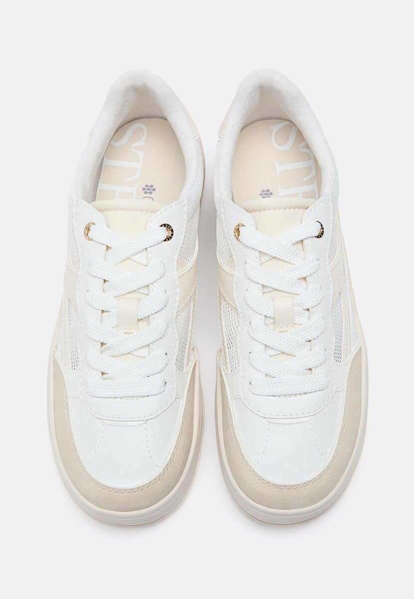 Baskets à semelle compensée associant des matériaux ajourés et unis. Fermeture à lacets. Disponibles en beige. Hauteur de la semelle : 5 cm.