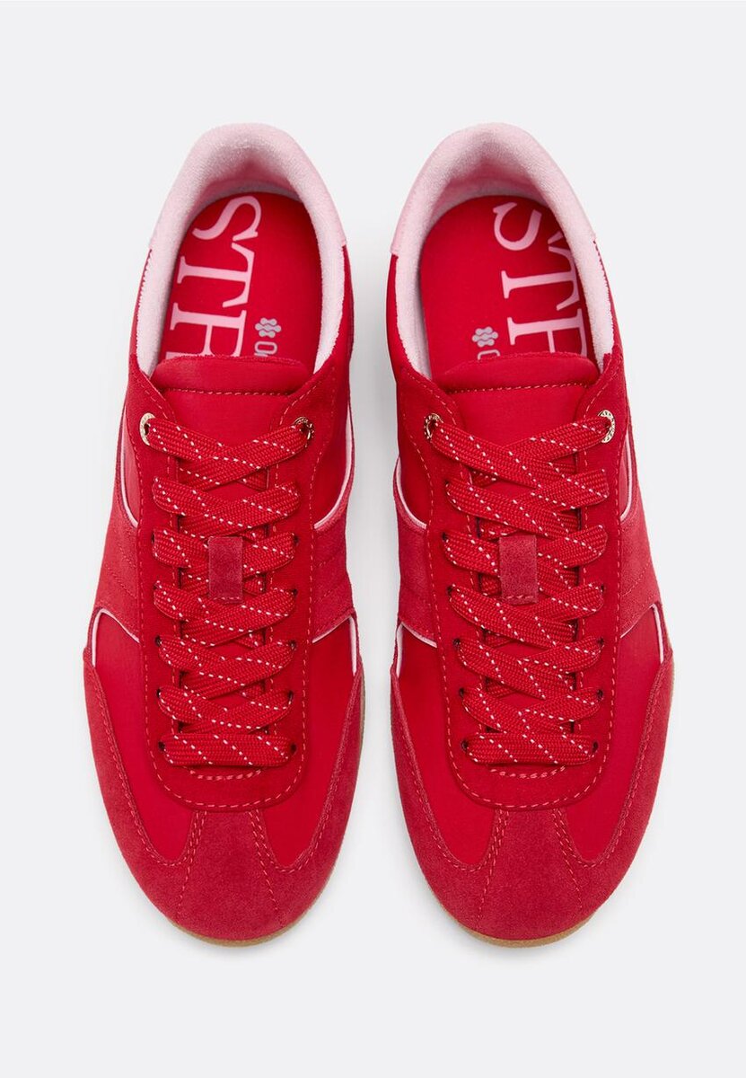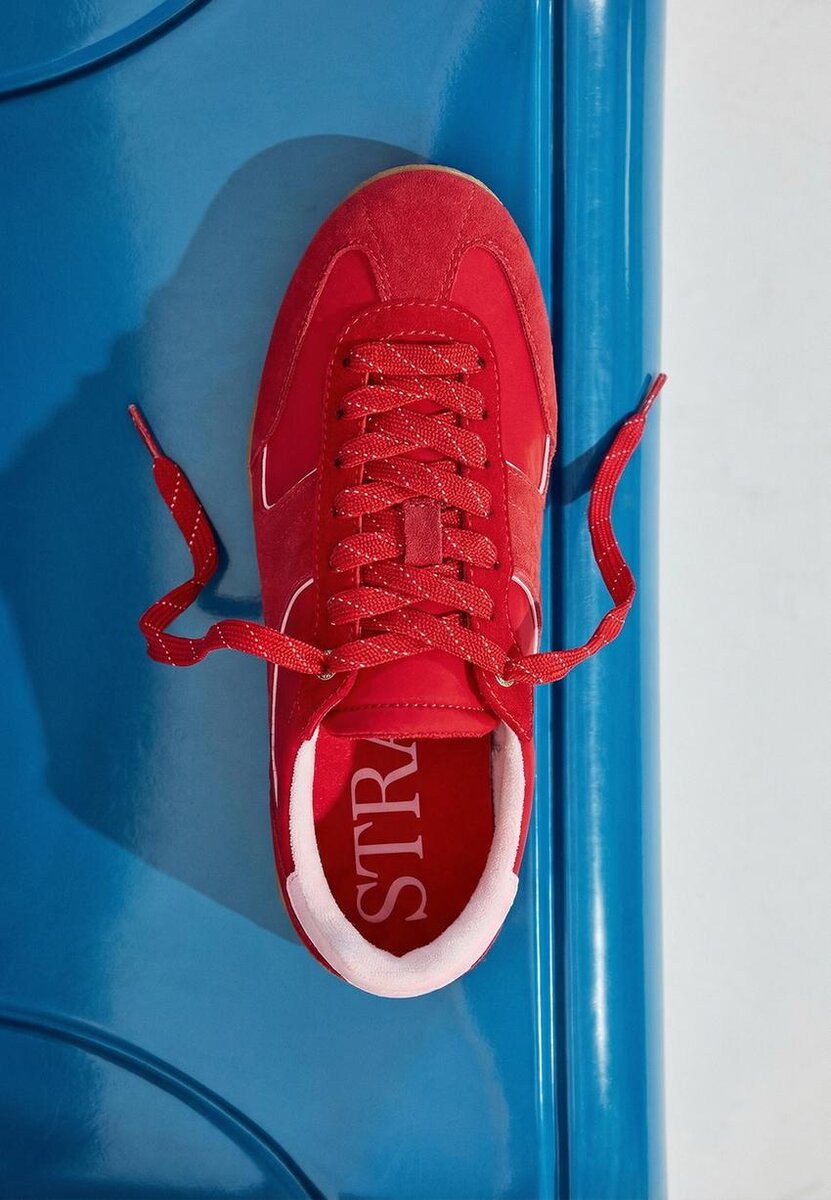 Baskets à semelle plate avec détails en cuir sur les côtés, l’embout et le talon. Fermeture à lacets. Disponibles en rouge. Hauteur de la semelle : 2,5 cm.