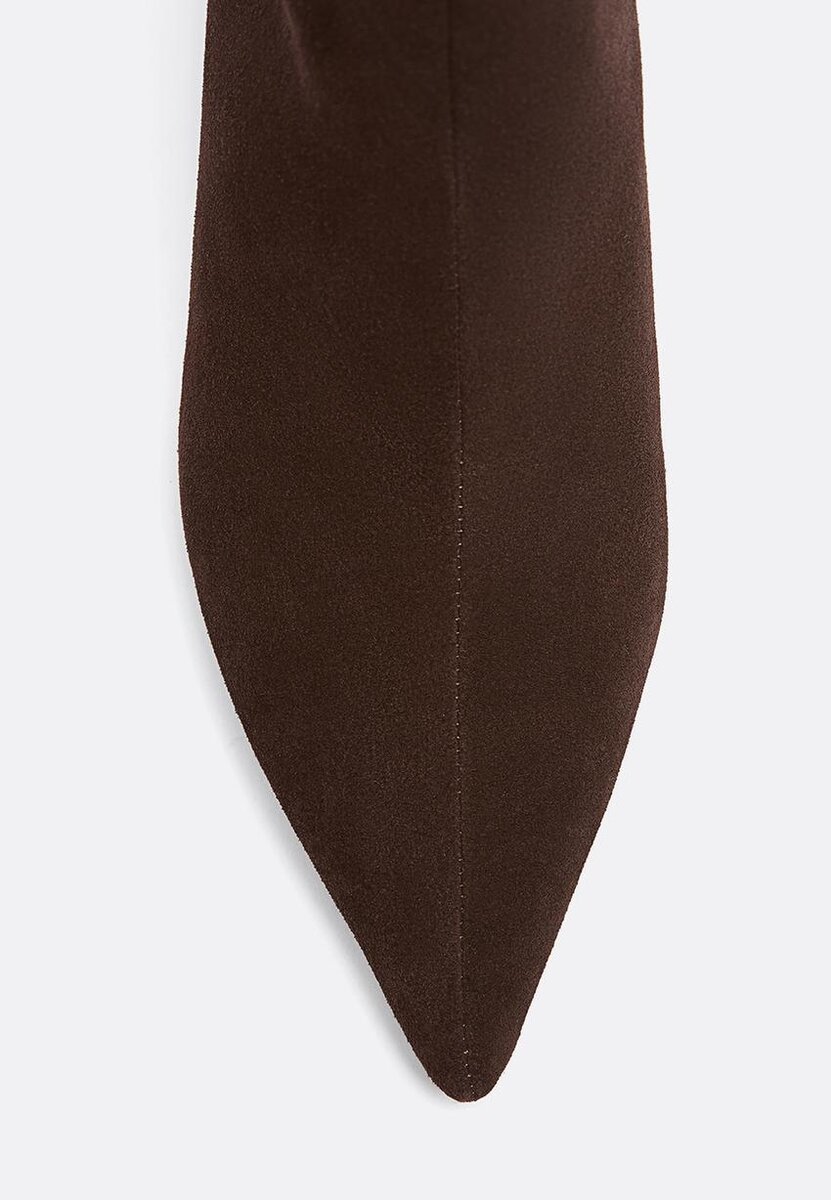 Bottines à talon aiguille. Matériau : cuir refendu. Bout pointu. Disponibles en marron. Hauteur du talon : 4 cm.