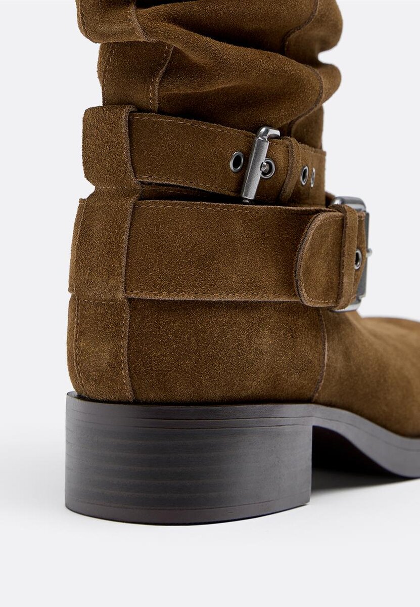 Bottines plates en cuir à tige Slouchy et détail boucle. Finition à bout carré. Disponibles en marron. Hauteur de la semelle : 4 cm.