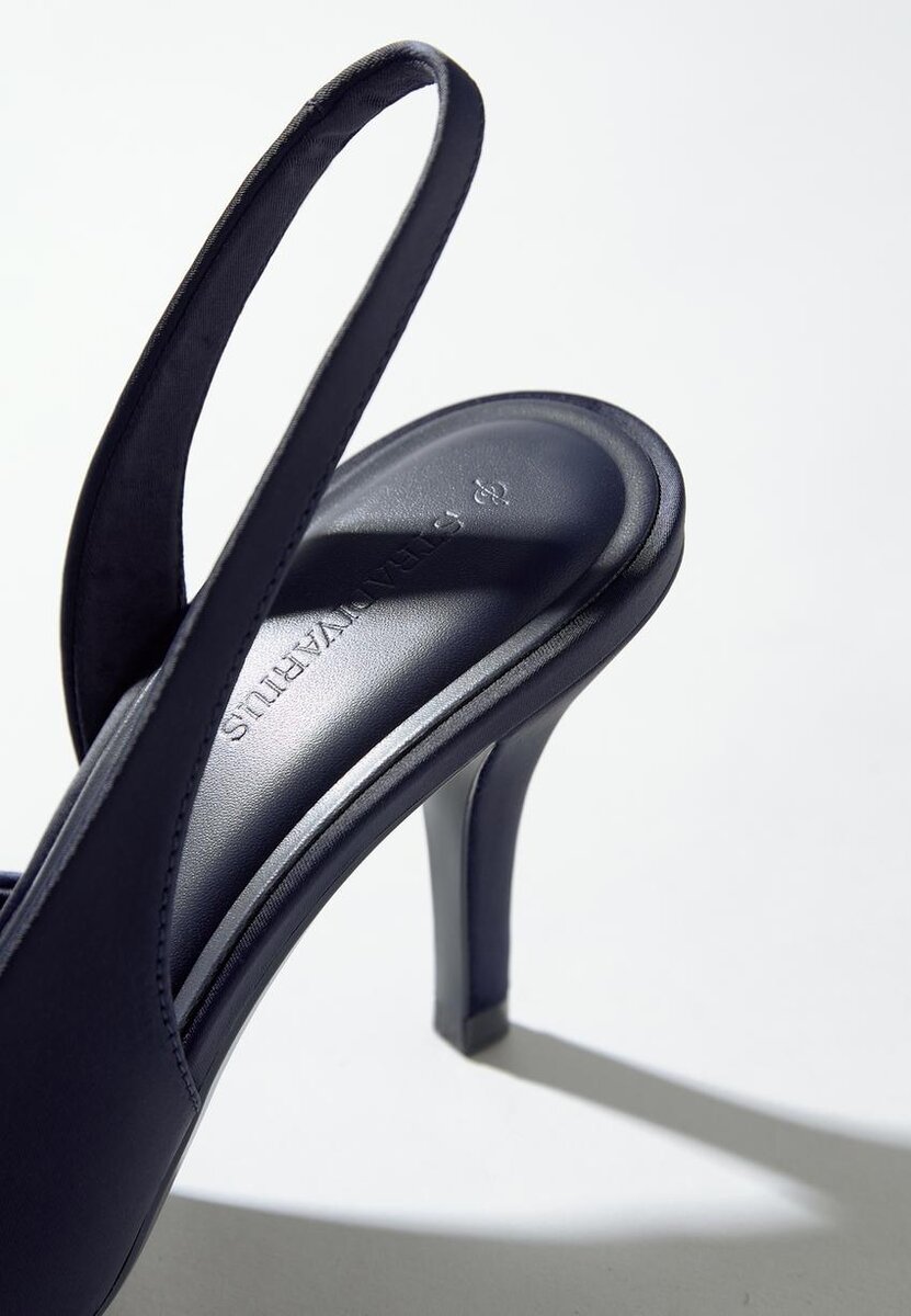 Chaussures à talons effet satin. Bout pointu. Bride autour du talon. Disponibles en bleu. Hauteur du talon : 8 cm