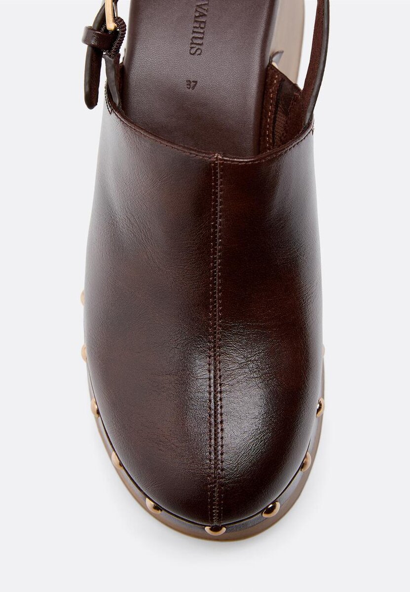 Sabots à plateforme à talon. Semelle en bois. Détails cloutés. Bride réglable à boucle au talon. Hauteur du talon : 7 cm