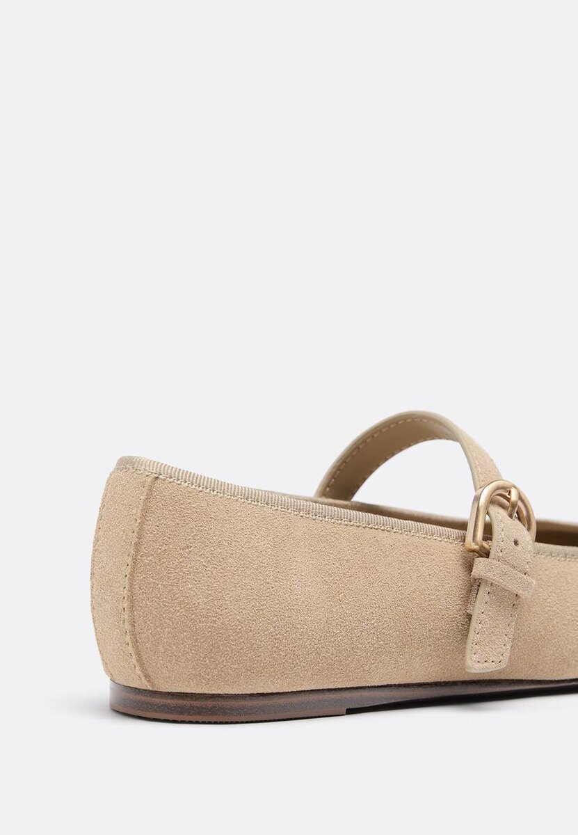 Ballerines en cuir avec bout. Fermeture à bride sur le cou-de-pied avec boucle réglable. Col rond. Disponibles en marron et beige.