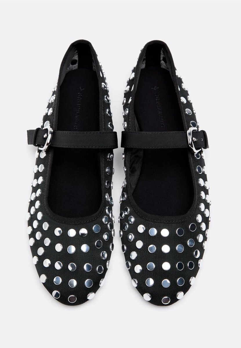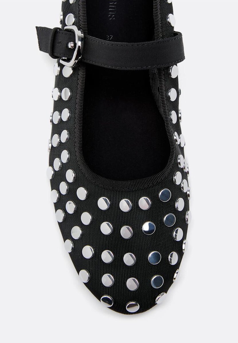 Ballerines en maille avec clous. Bride réglable à boucle sur le cou-de-pied. Bout rond. Disponibles en noir.