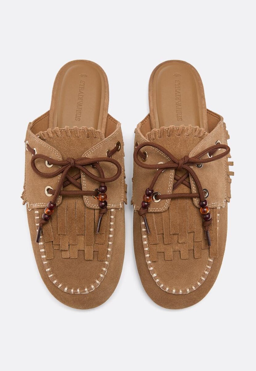 Mocassins en cuir sans talon avec breloques et lacets frangés sur le cou-de-pied. Disponibles en marron.