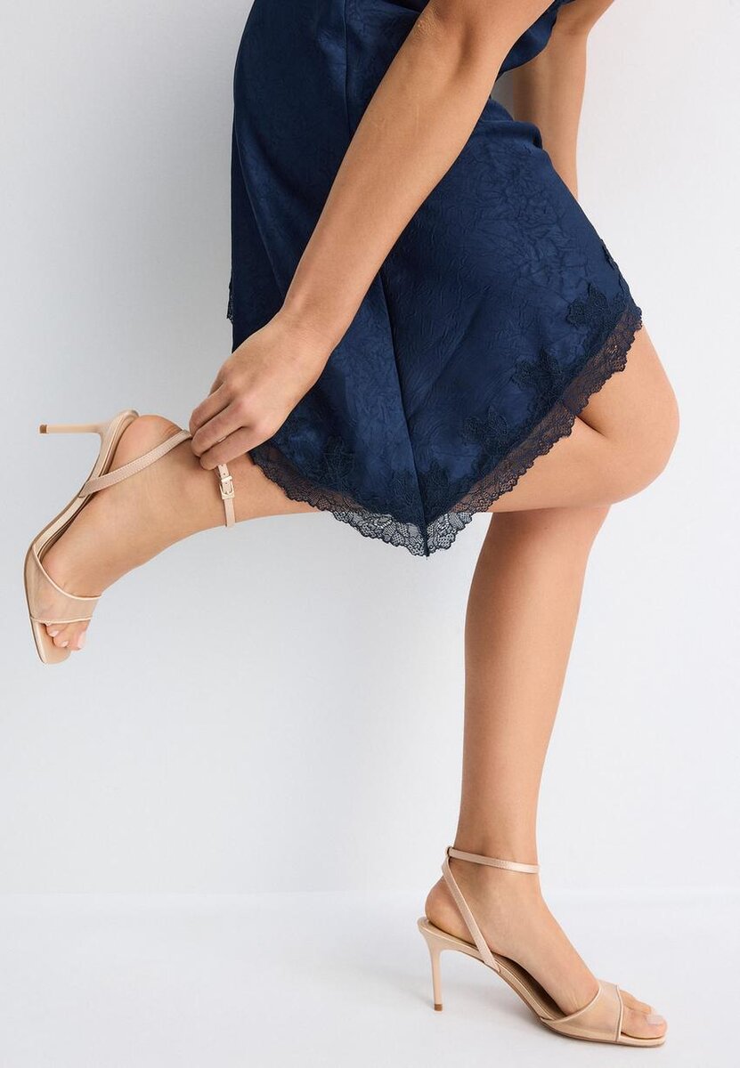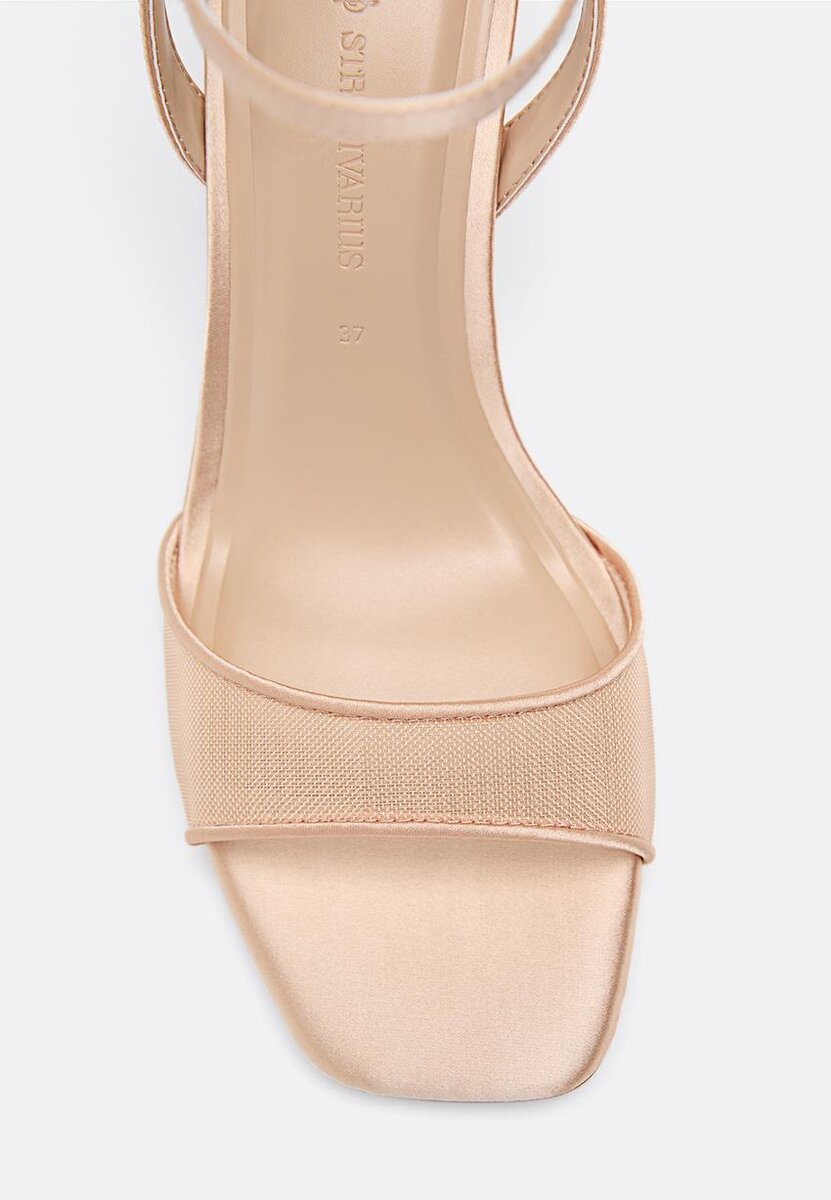 Sandales à talons, ouvertes à l’arrière, avec effet satiné et bride en maille sur le cou-de-pied. Fermeture à bride à la cheville avec boucle réglable. Disponibles en beige. Hauteur du talon : 8 cm.