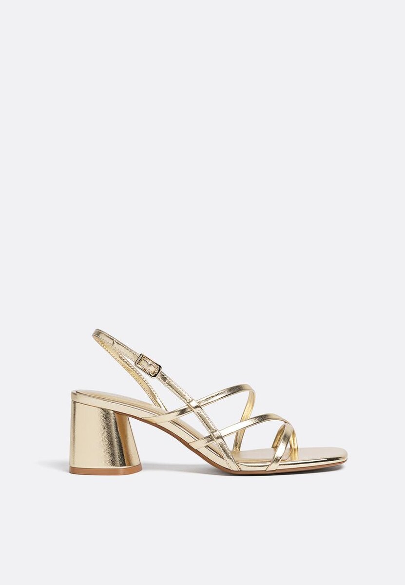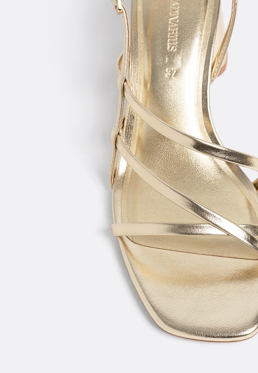 Sandales à talons carrés. Lanières sur le cou-de-pied. Fermeture à boucle. Disponibles en or. Hauteur du talon : 5,5 cm.