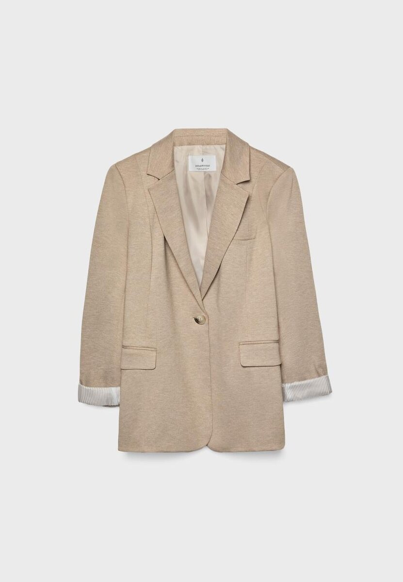 Blazer à col à revers et manches longues retroussables avec doublure rayée. Doté de poches à rabat sur le devant et d’une fermeture à boutons sur le devant.