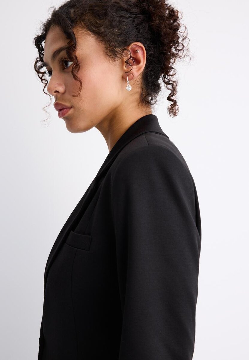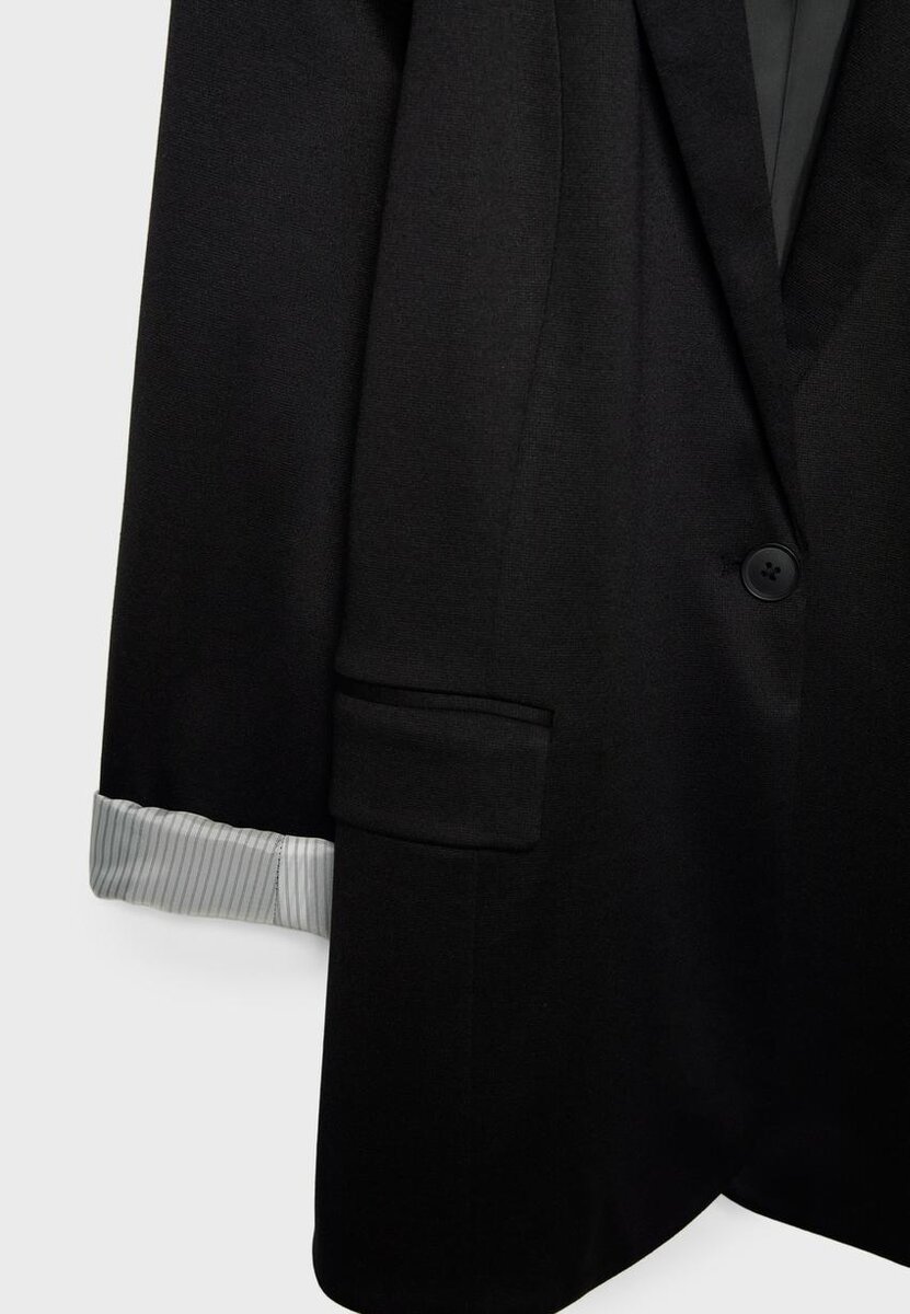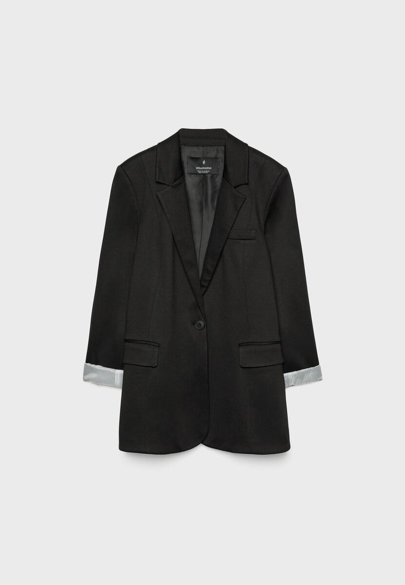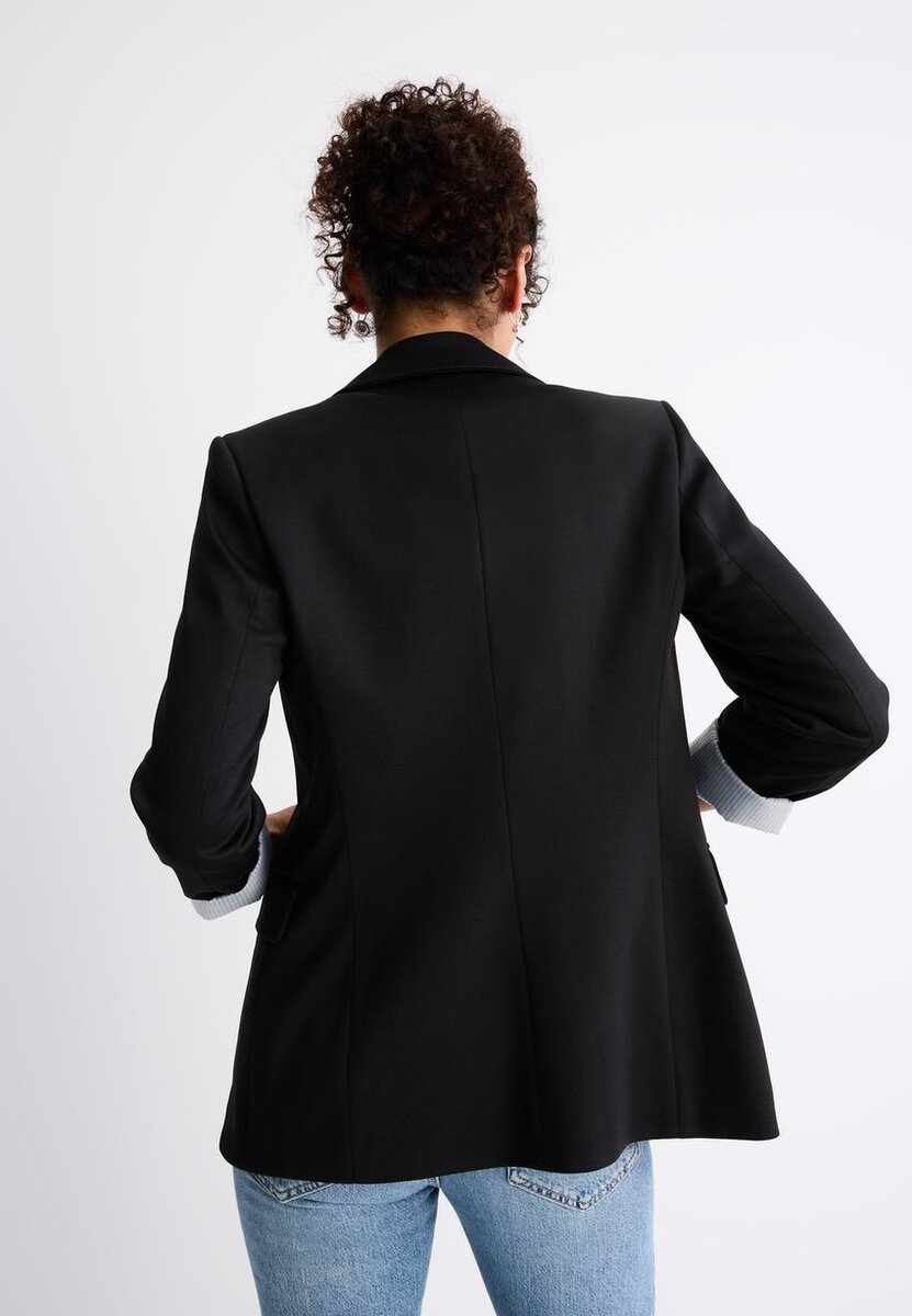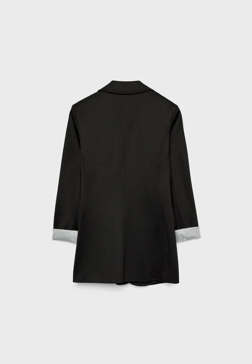 Blazer à col à revers et manches longues retroussables avec doublure rayée. Doté de poches à rabat sur le devant et d’une fermeture à boutons sur le devant.