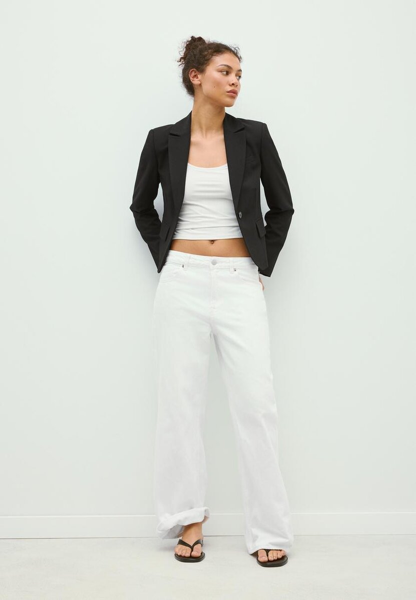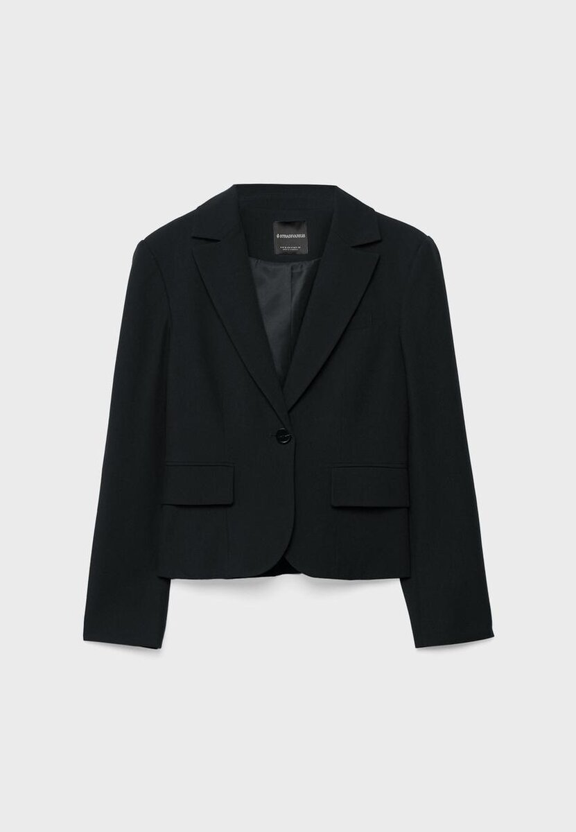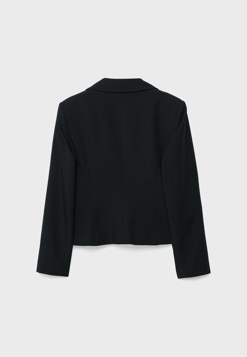 Blazer court confectionné dans un tissu mélangé en viscose extensible pour plus de confort et de liberté de mouvement. Col à revers et manches longues flares. Poches passepoilées à rabats sur le devant. Fermeture à boutons sur le devant. Disponible en plusieurs couleurs.