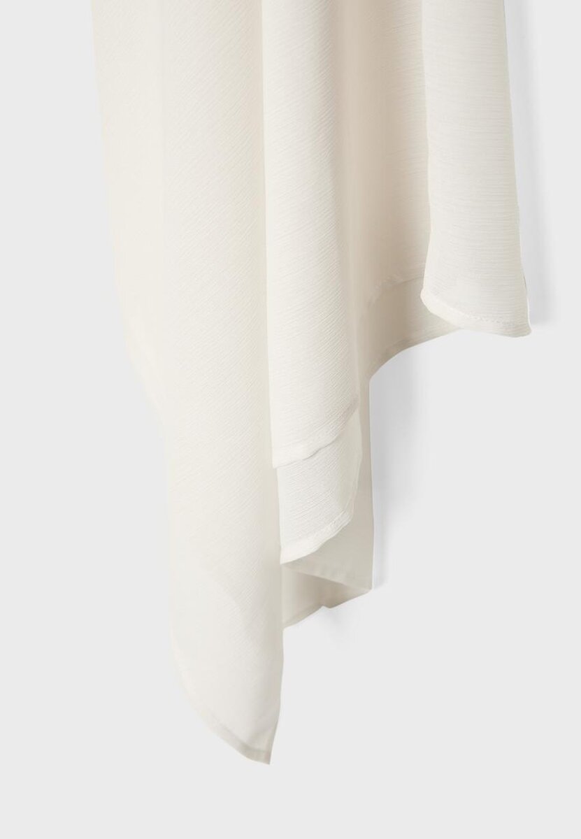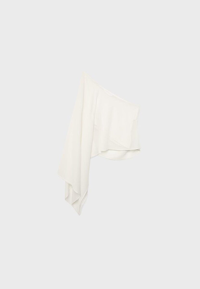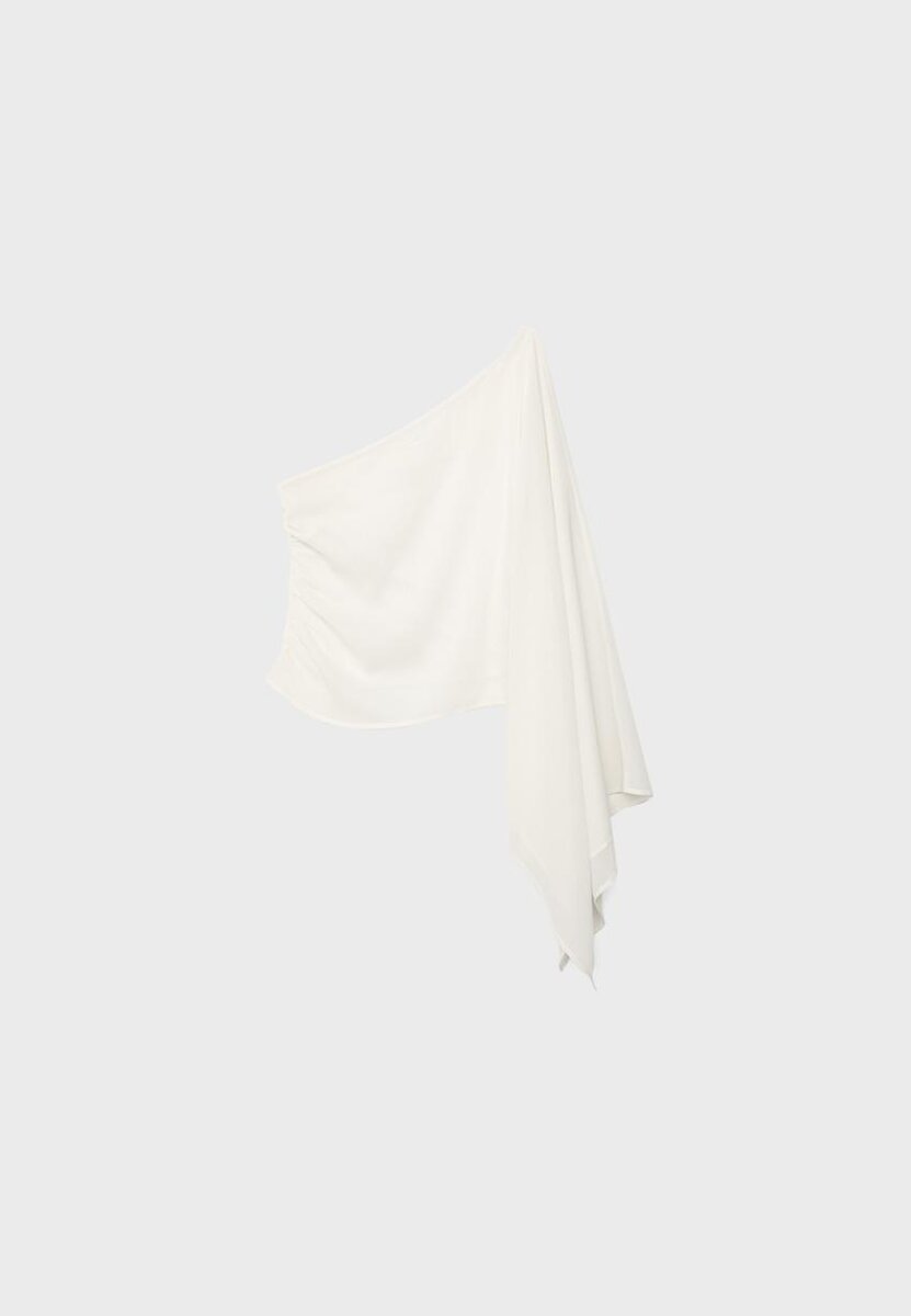 Cape asymétrique avec une manche large et une épaule dénudée. Détail froncé sur le côté. Disponible en plusieurs couleurs.