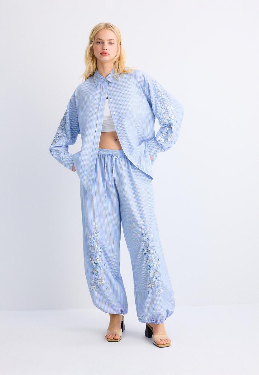 Chemise droite en coton avec col Johnny et manches longues à revers. Ornée de broderies à paillettes sur les manches et d’une fermeture à boutons sur le devant.