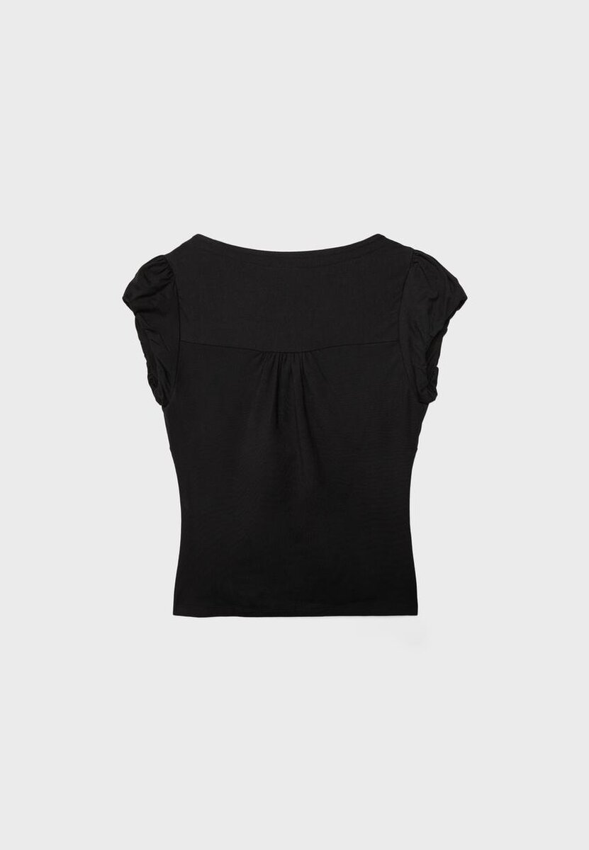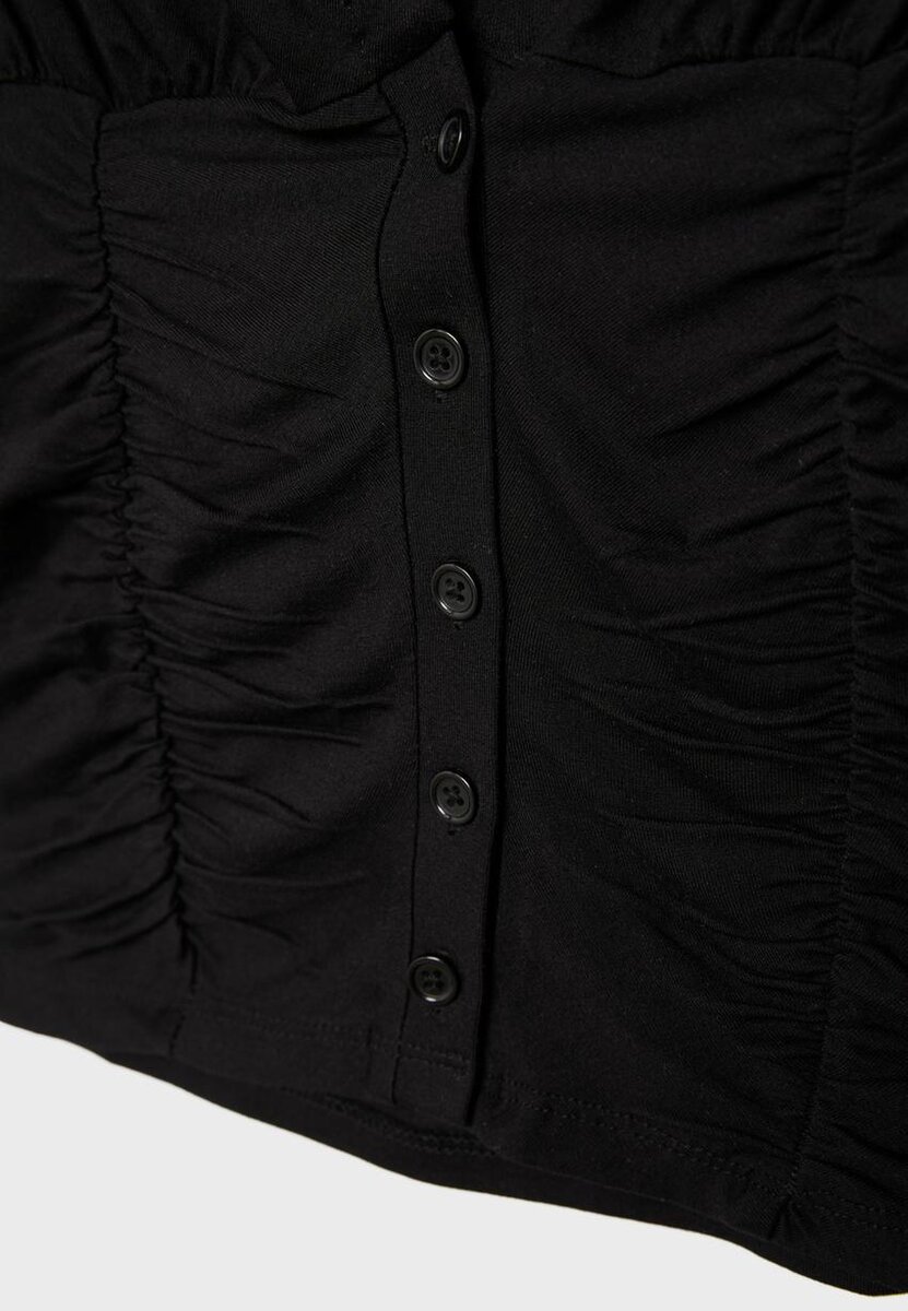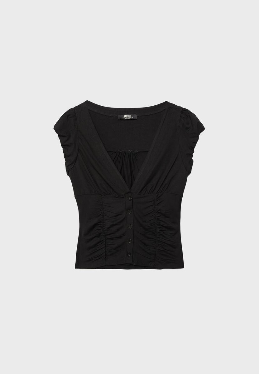 Chemise ajustée à col en V et manches courtes. Fermeture à boutons sur le devant. Détail froncé sur le côté. Disponible en plusieurs couleurs.