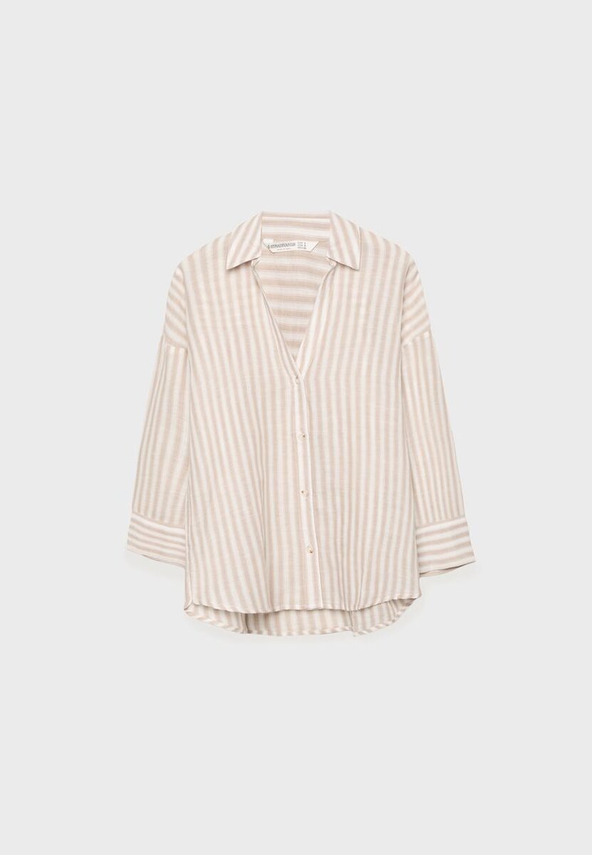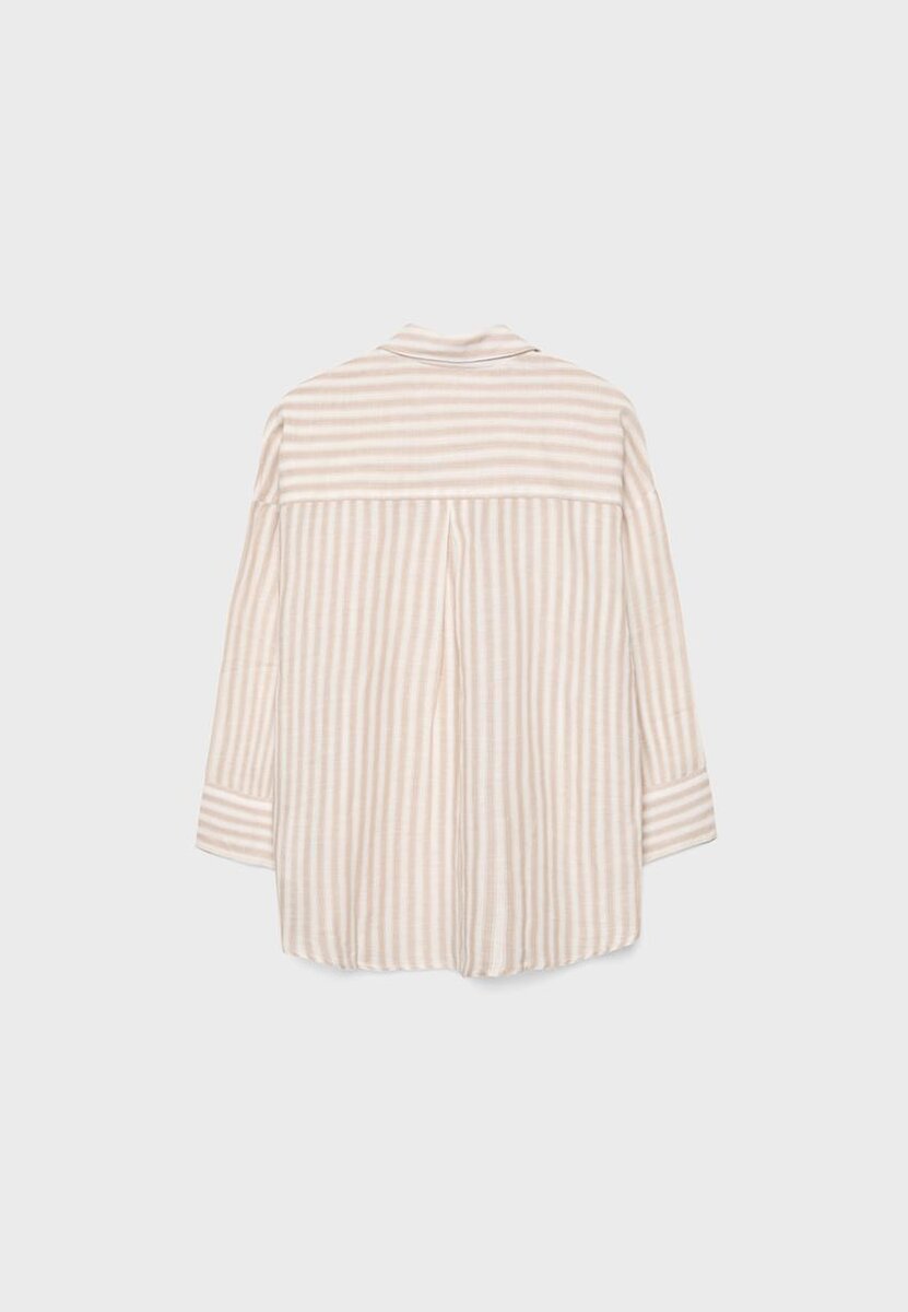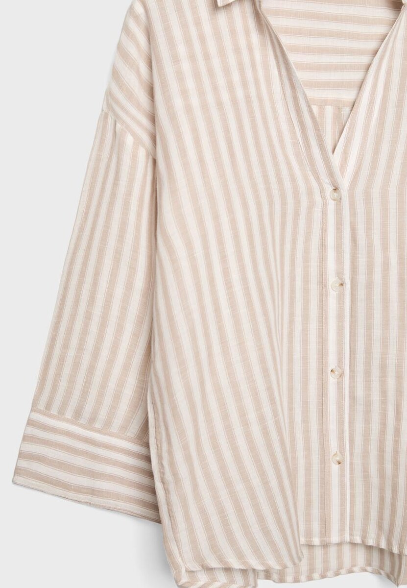 Chemise confectionnée dans un tissu contenant 30 % de lin. Col à revers et manches kimono en tissu effet lin. Fermeture à boutons sur le devant. Disponible en plusieurs couleurs.