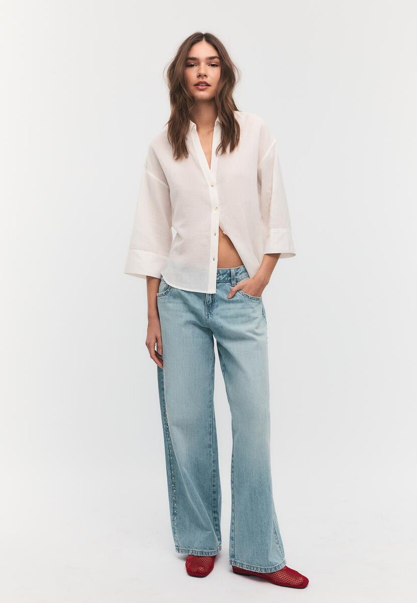 Chemise confectionnée dans un tissu contenant 30 % de lin. Col à revers et manches kimono en tissu effet lin. Fermeture à boutons sur le devant. Disponible en plusieurs couleurs.