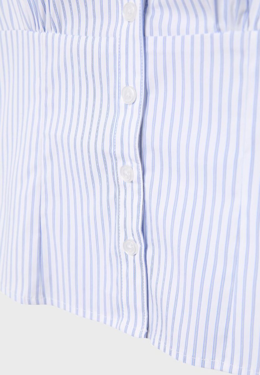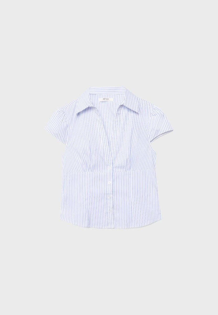 Chemise ajustée à col à revers et encolure en V, avec manches courtes. Fermeture à boutons sur le devant. Disponible en plusieurs couleurs.