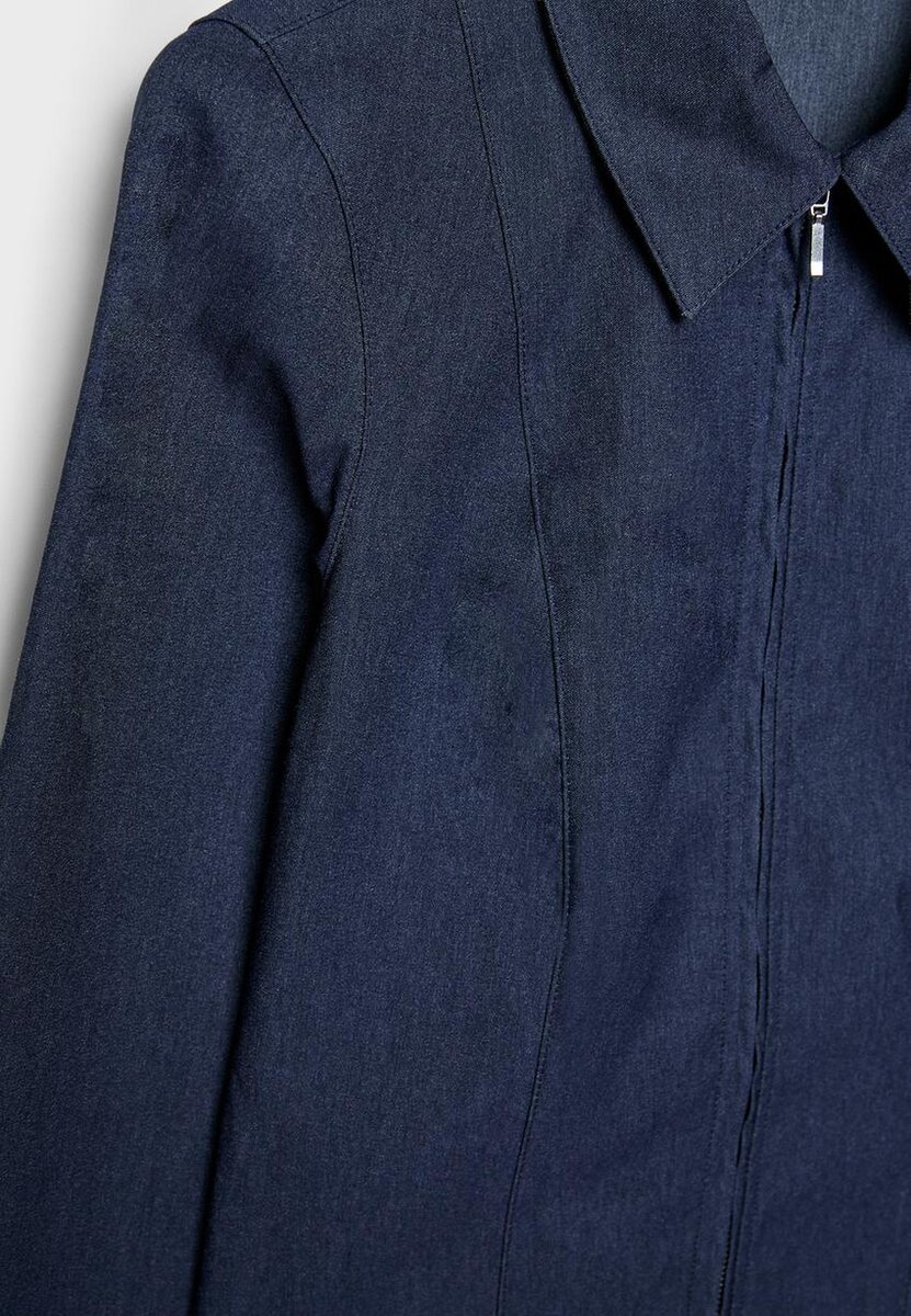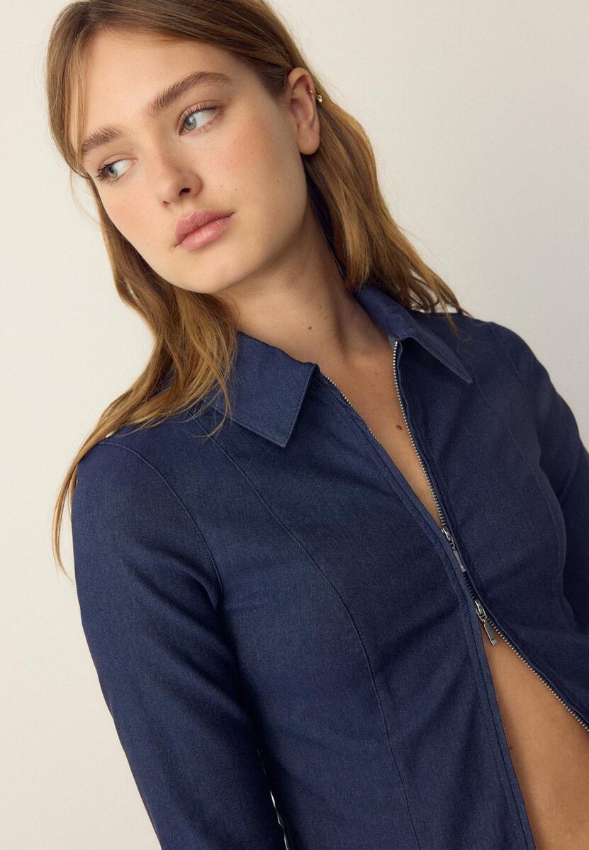 Chemise ajustée en denim bengaline. Col à revers et manches longues. Fermeture à glissière double sur le devant.
