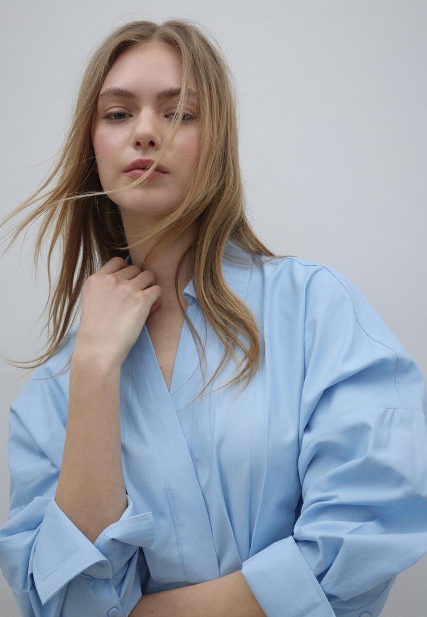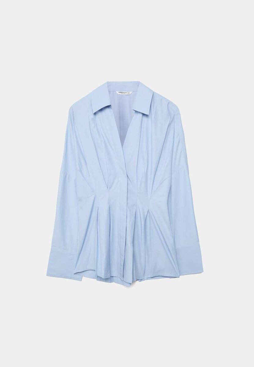 Chemise à col en V avec col à revers et manches longues. Avec plis à la taille et fermeture à boutons sur le devant.