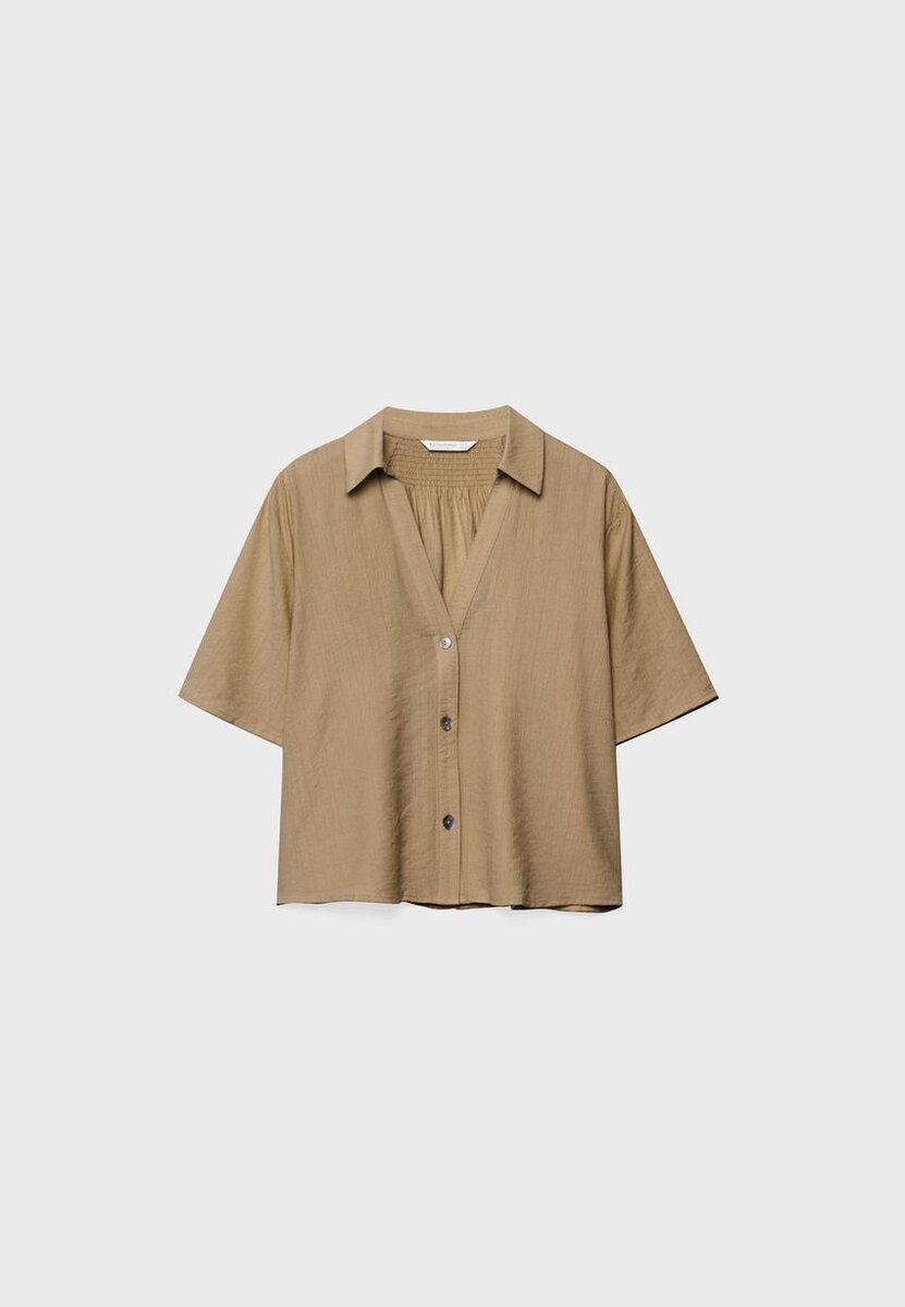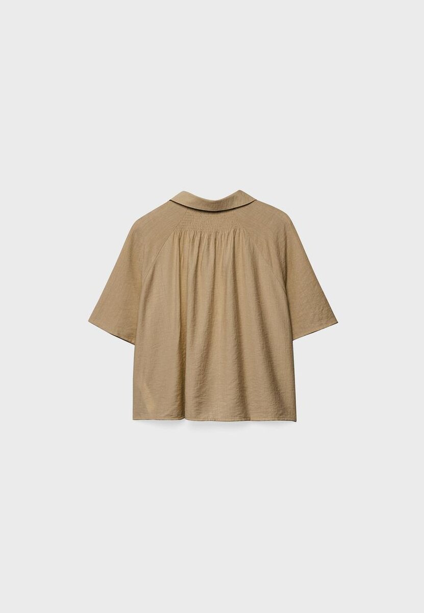 Chemise fluide à col et manches courtes. Avec une fermeture boutonnée sur le devant et un détail en tissu alvéolé dans le dos. Disponible en plusieurs couleurs.