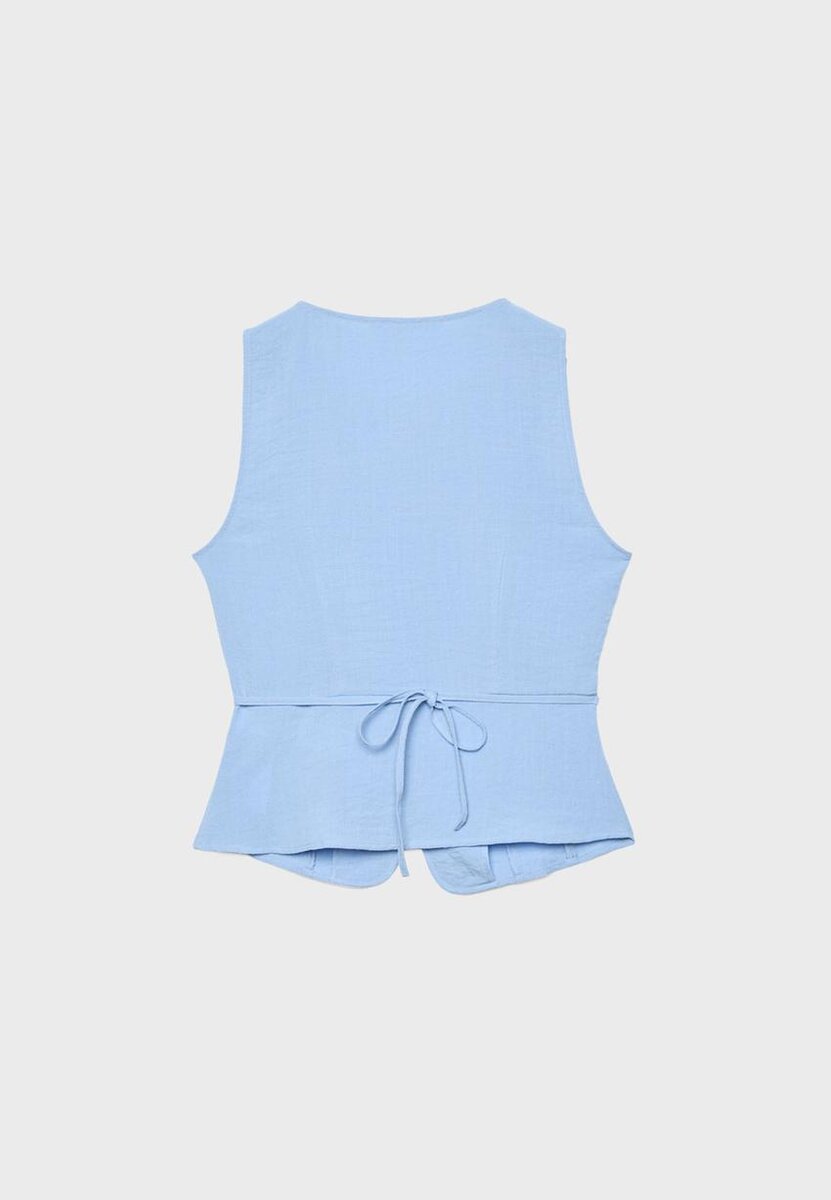 Gilet sans manches à col rond. Fermeture à boutons sur le devant et cordon de serrage réglable à l’arrière. Disponible dans une gamme de couleurs.