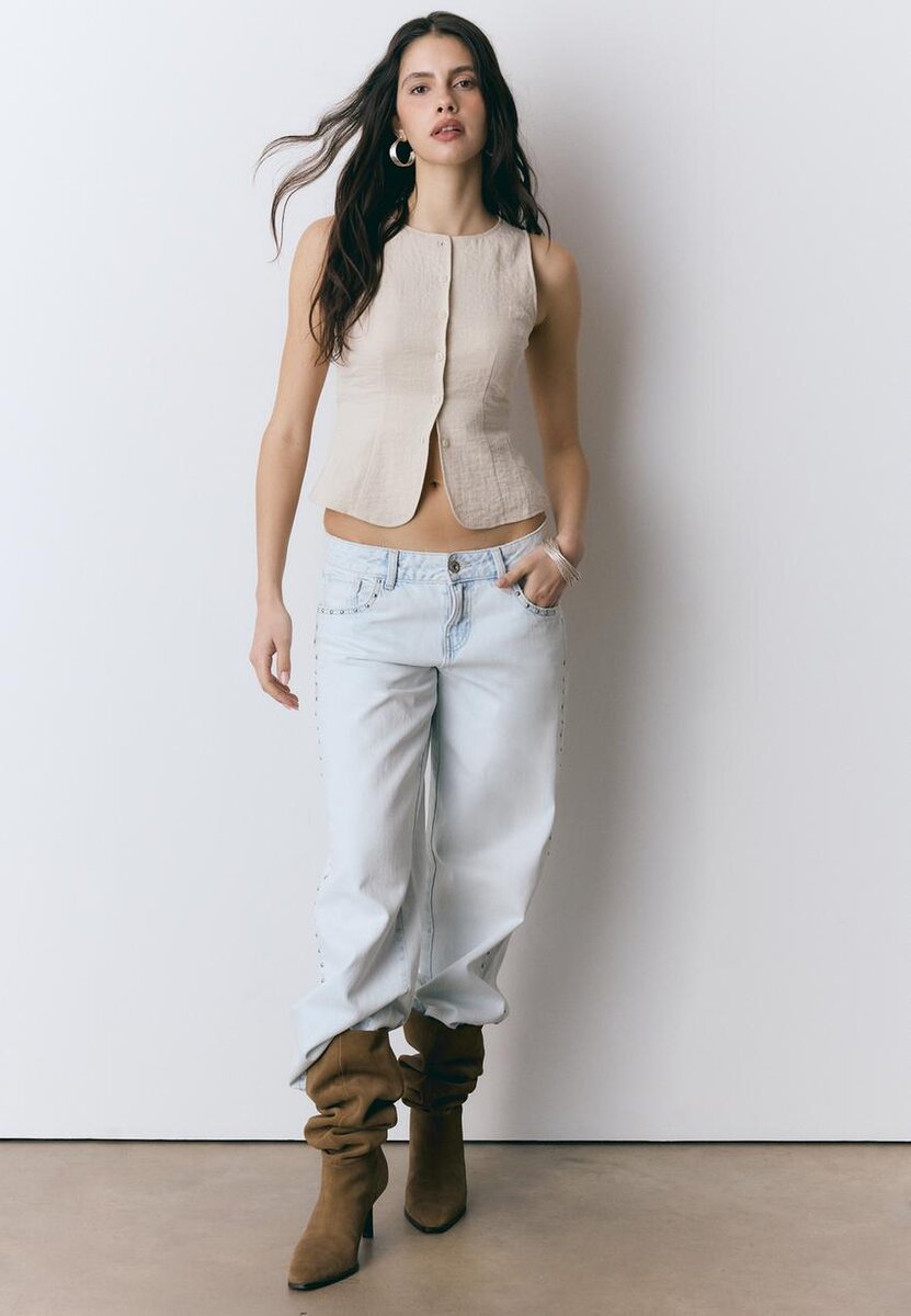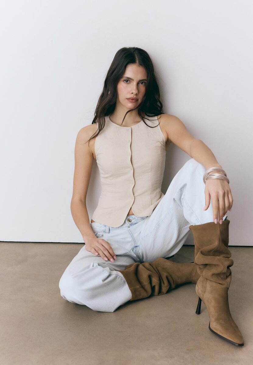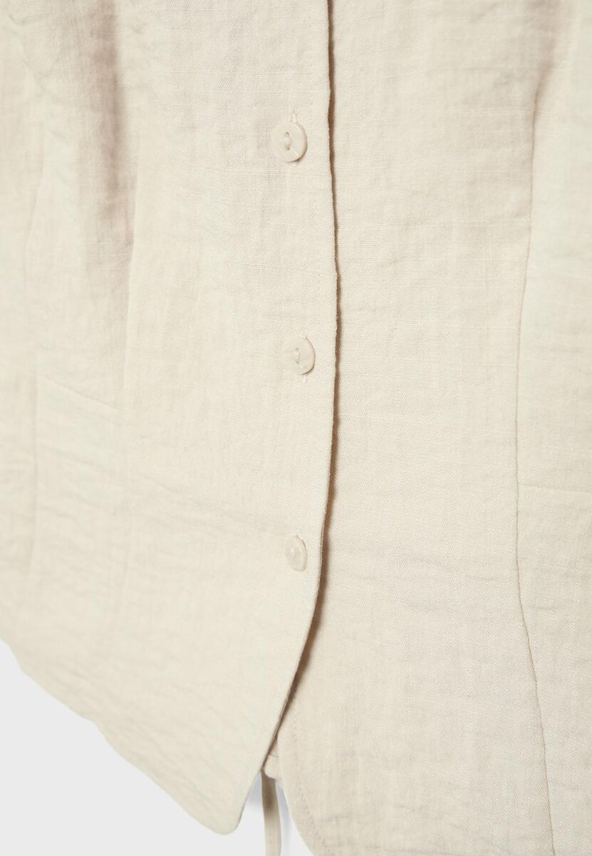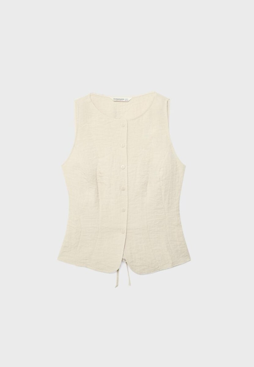 Gilet sans manches à col rond. Fermeture à boutons sur le devant et cordon de serrage réglable à l’arrière. Disponible dans une gamme de couleurs.