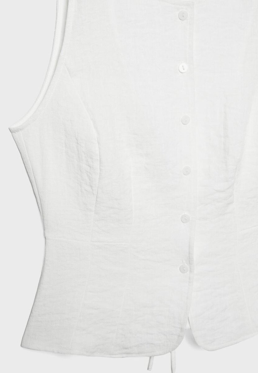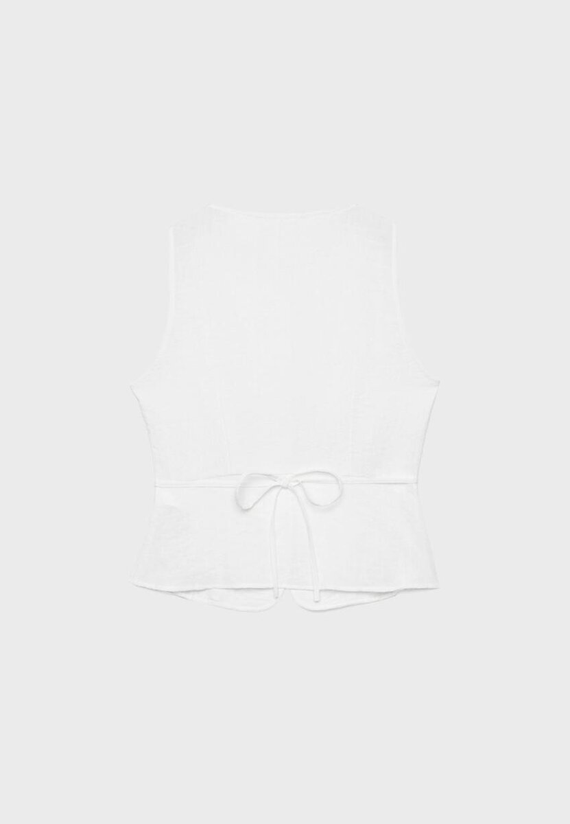 Gilet sans manches à col rond. Fermeture à boutons sur le devant et cordon de serrage réglable à l’arrière. Disponible dans une gamme de couleurs.