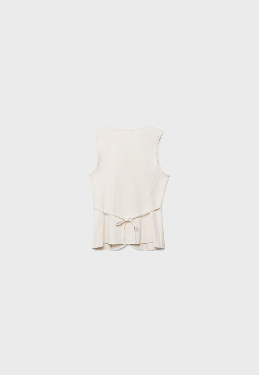 Haut ajusté en denim style gilet, col en V et sans manches. Fermeture à l’avant avec boutons assortis. Disponible en plusieurs couleurs.