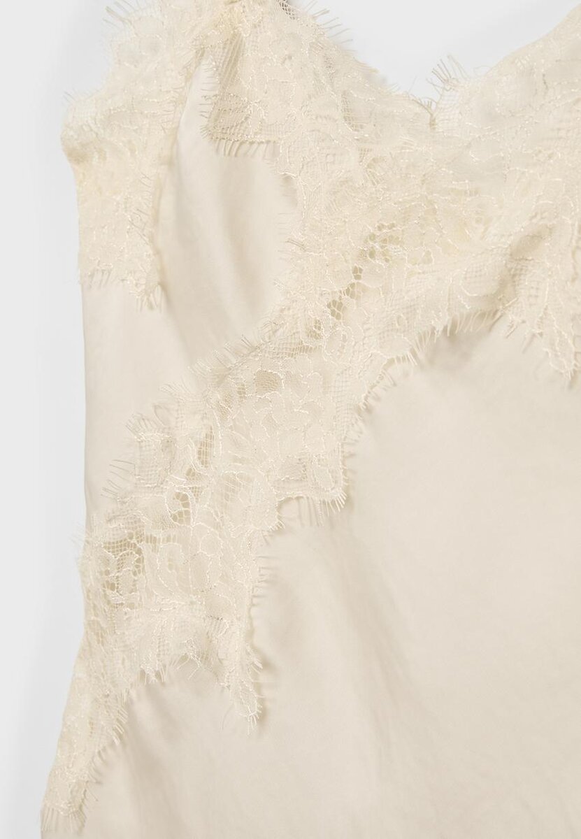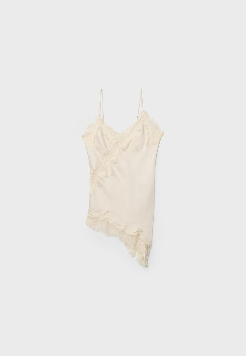 Haut en satin. Col en V et fines bretelles. Appliques en dentelle assorties et ourlet asymétrique.