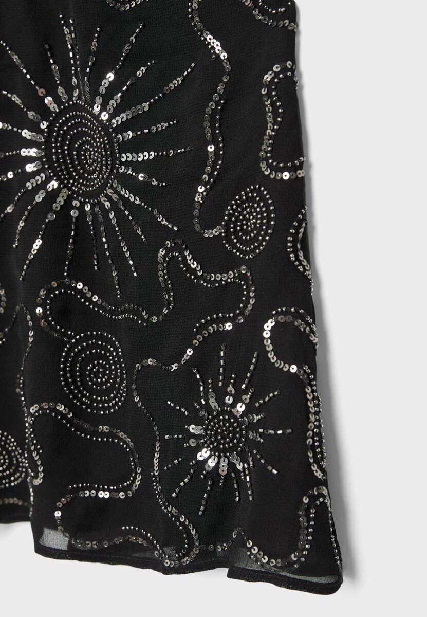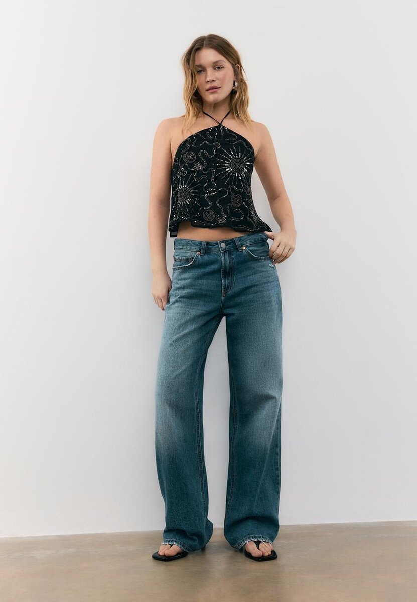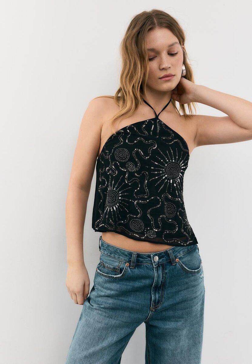 Hauts en viscose. Col dos nu avec nouage dans le dos et bretelles fines. Détails brodés avec des applications de perles. Ourlet ondulé.
