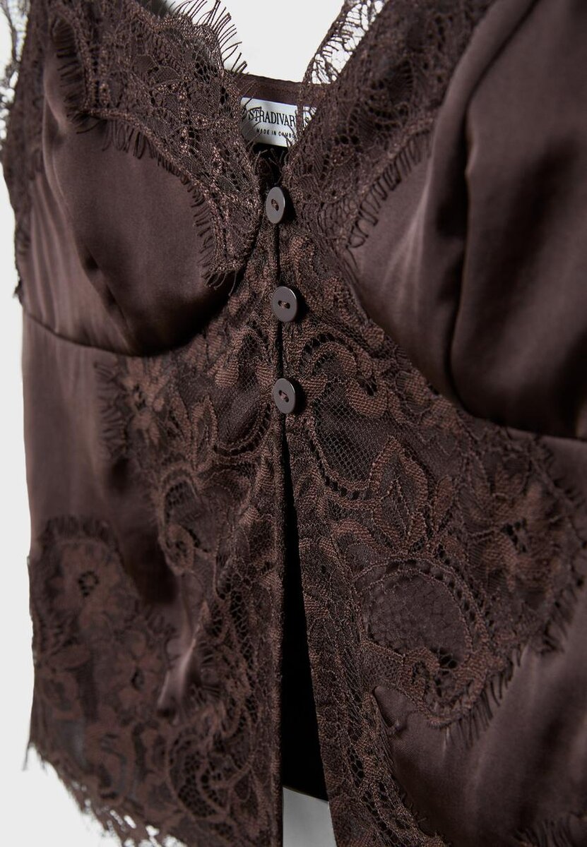 Hauts confectionnés dans un tissu effet satiné. Avec un décolleté en V et des bretelles fines. Détails en dentelle appliquée sur l’encolure et l’ourlet. Fente sur le devant. Disponible en plusieurs couleurs.