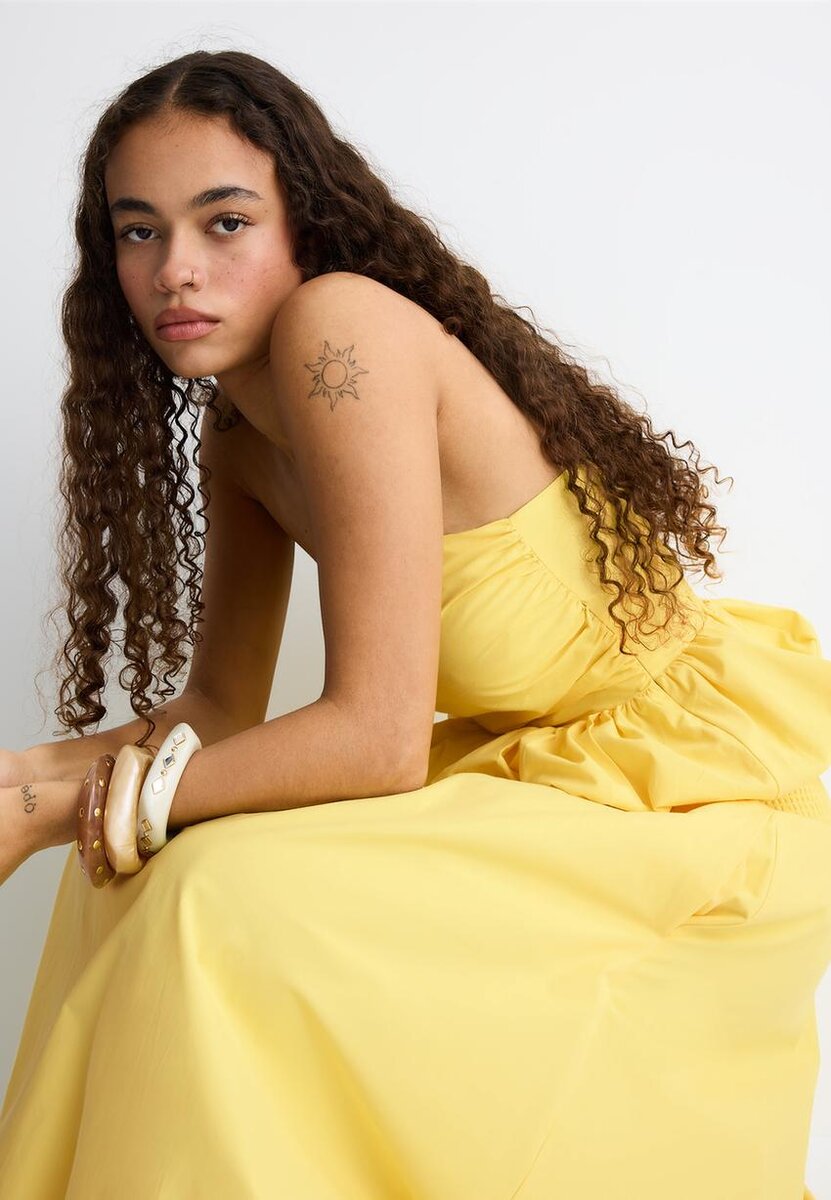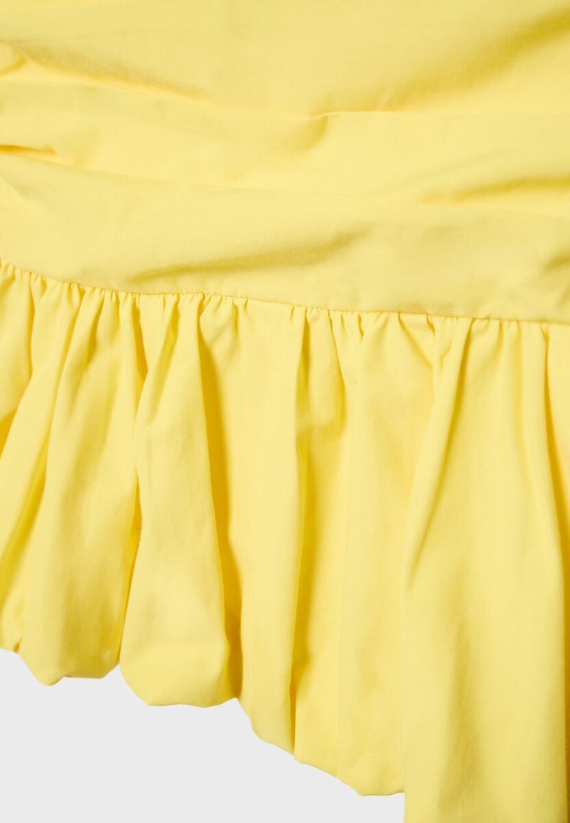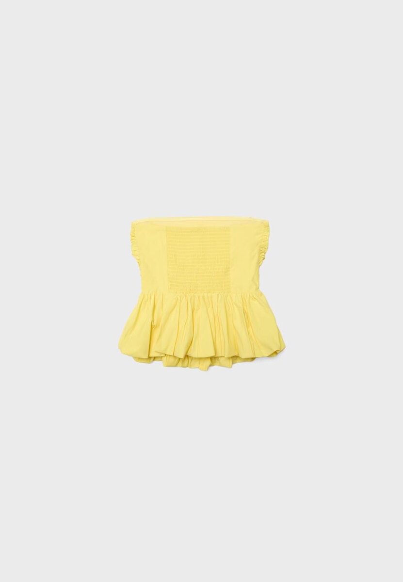 Haut ajusté en coton. Encolure sans bretelles. Avec des fronces et un ourlet ballon. Disponible en plusieurs couleurs.