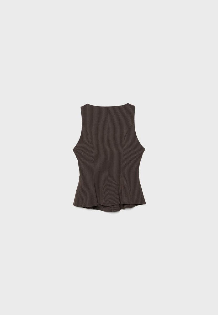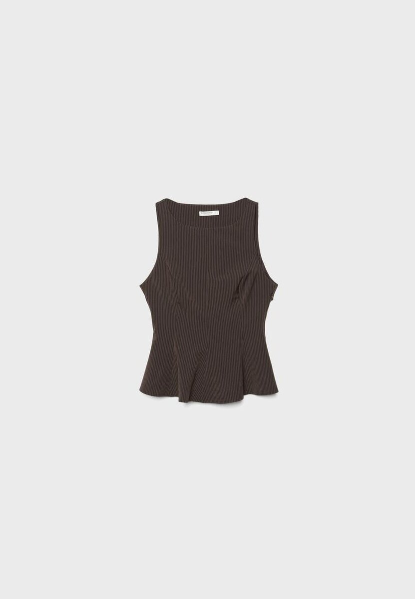 Haut ajusté en tissu stretch structuré. Col rond et coupe sans manches. Avec une taille cintrée et un ourlet fluide à volants. Fermeture à glissière latérale invisible.