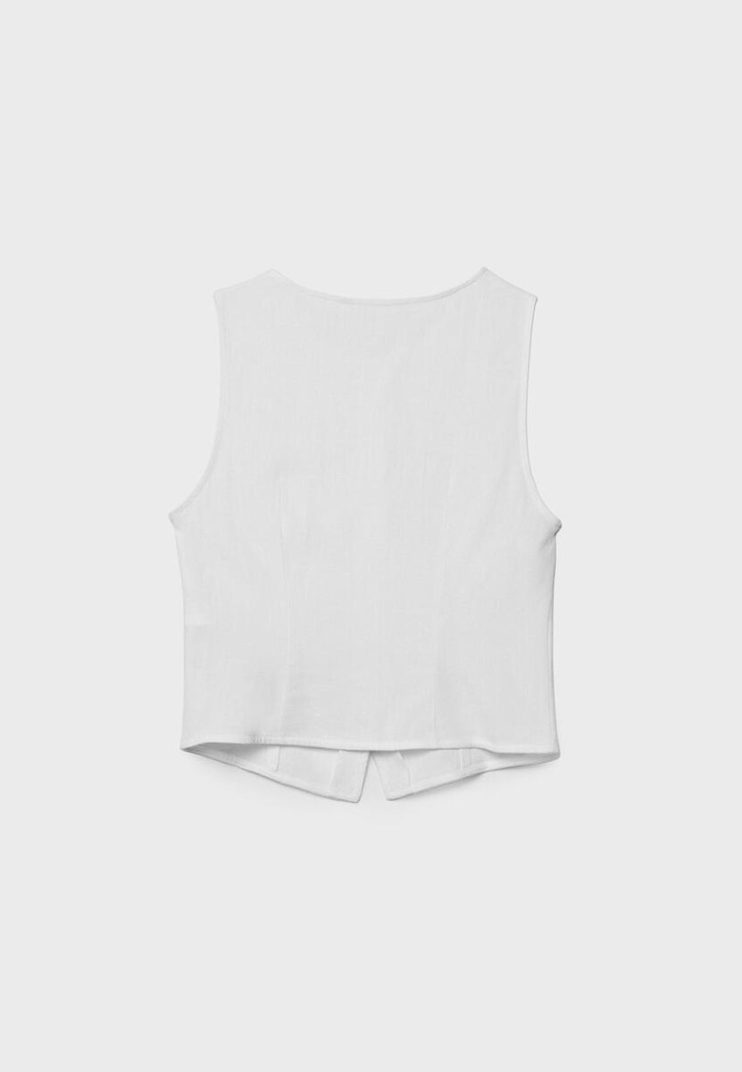 Haut ajusté sans manches à col rond. Fermeture à l’avant avec boutons ton sur ton. Disponible en plusieurs couleurs.