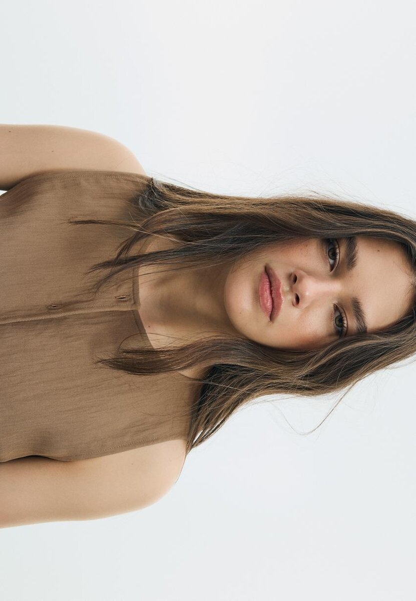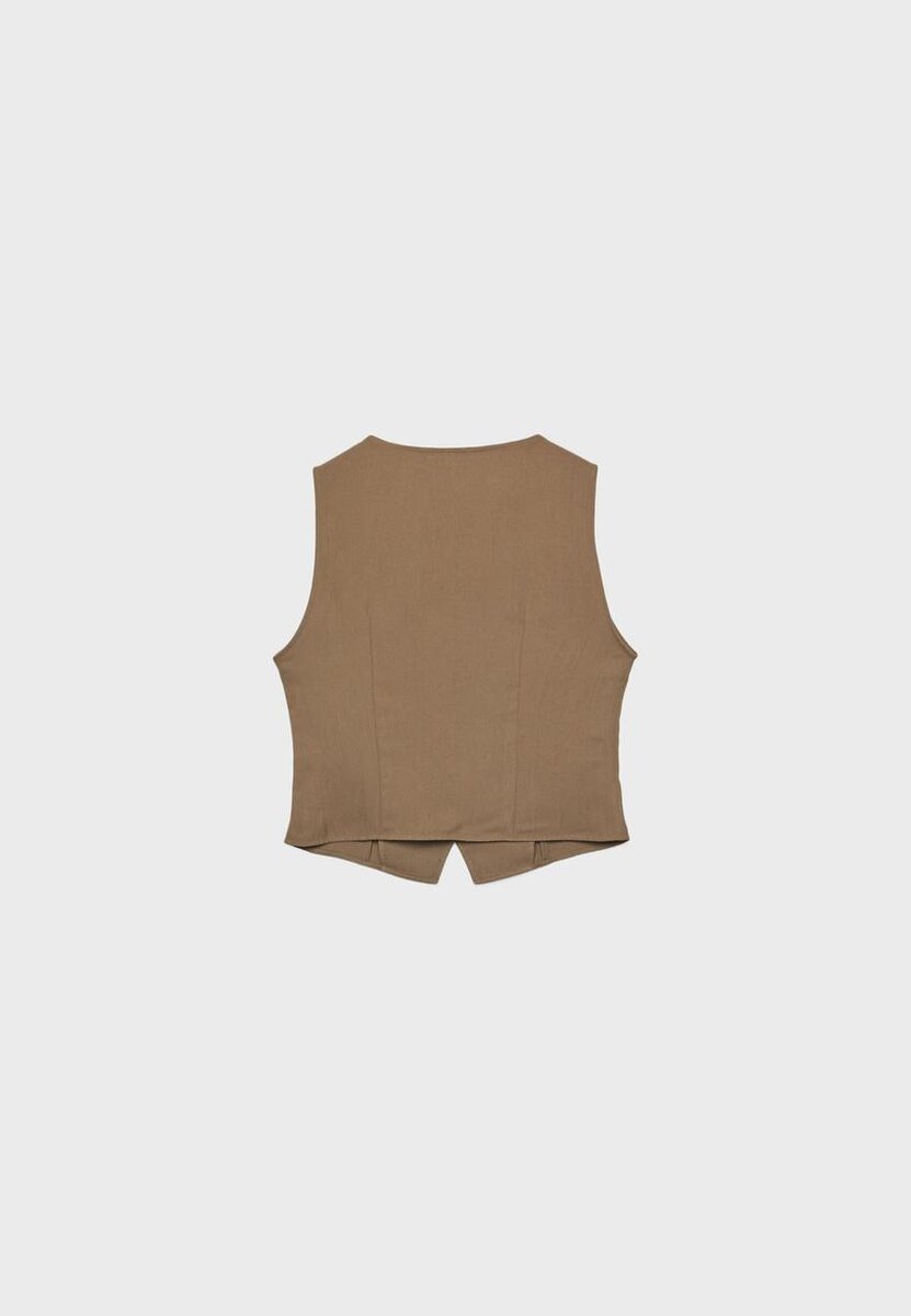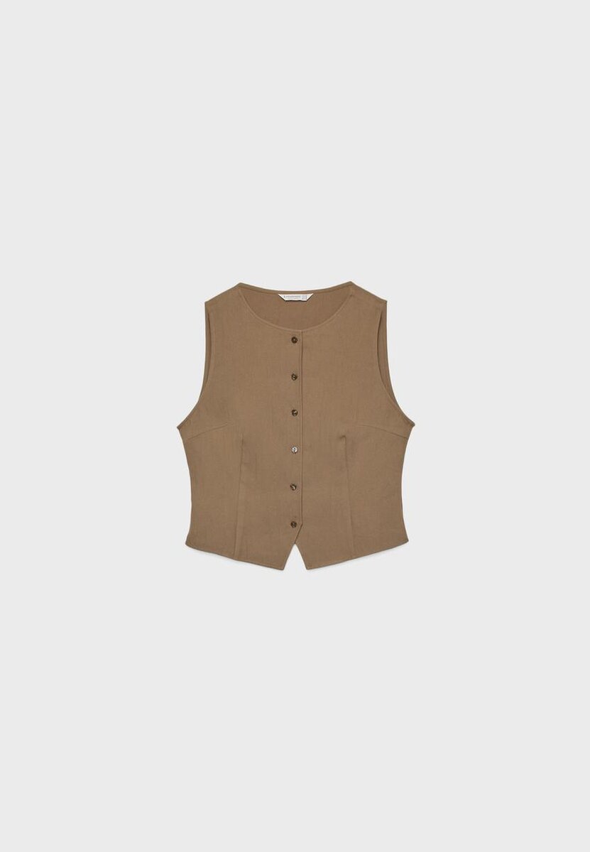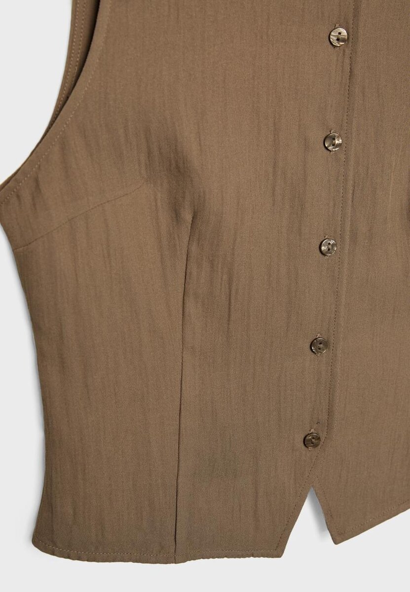 Haut sans manches en mélange de viscose. Col rond. Fente sur le devant au niveau de l’ourlet. Détail en tissu texturé froissé. Fermeture sur le devant avec boutons assortis. Disponible en plusieurs couleurs.