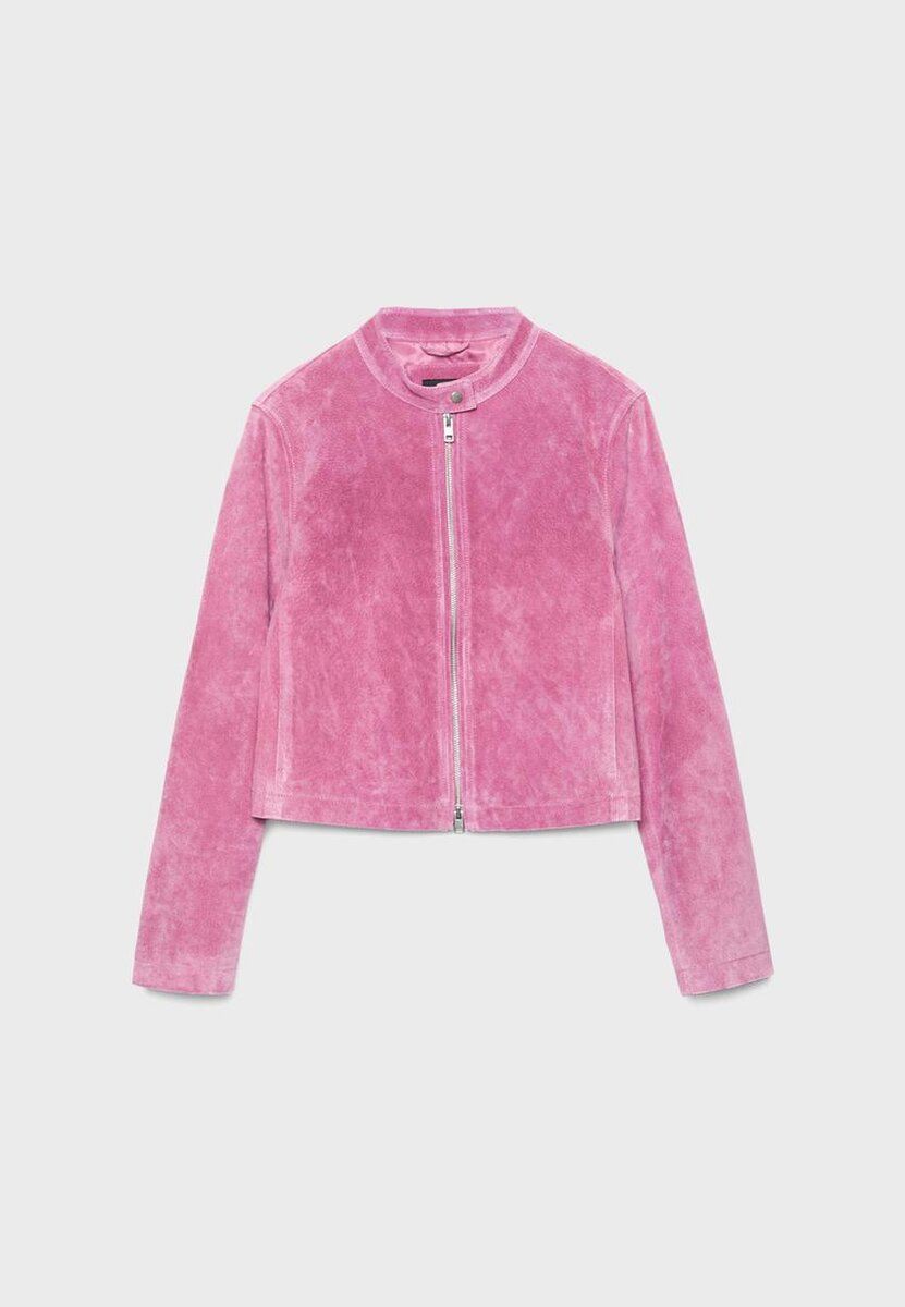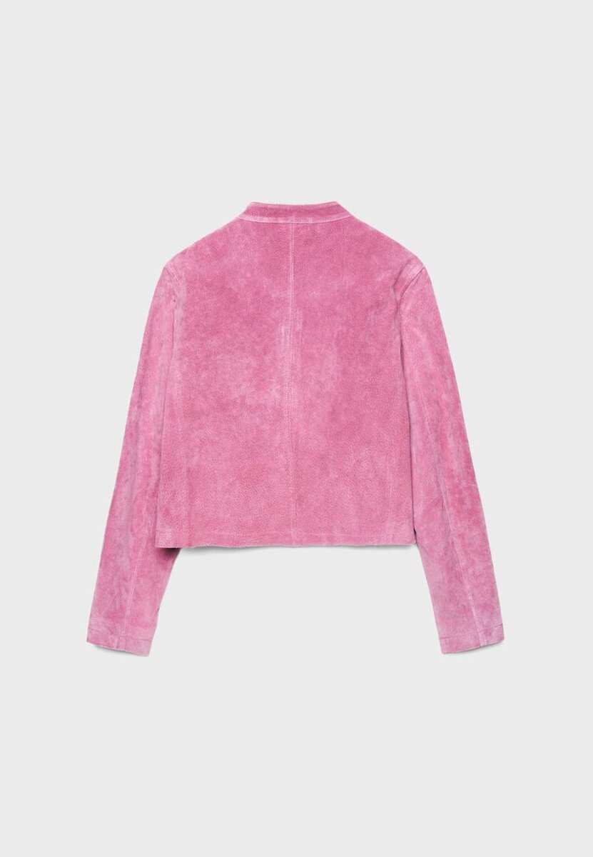 Veste courte confectionnée dans un tissu principal en cuir de porc et une doublure en polyester. Col montant avec bouton et manches longues. Poches latérales. Fermeture éclair double sens sur le devant.