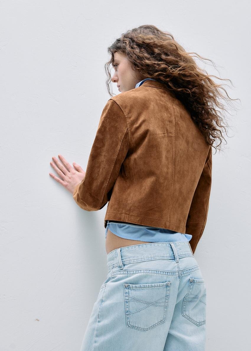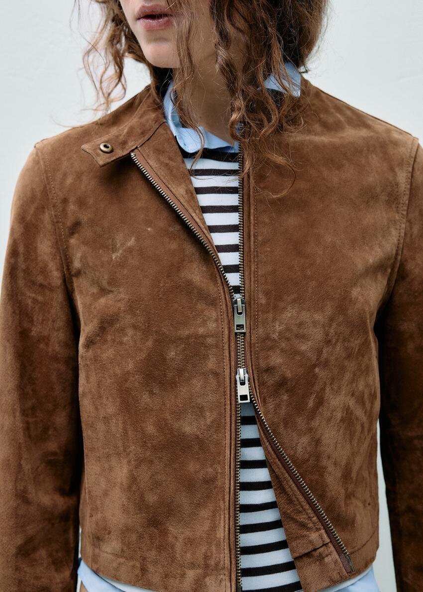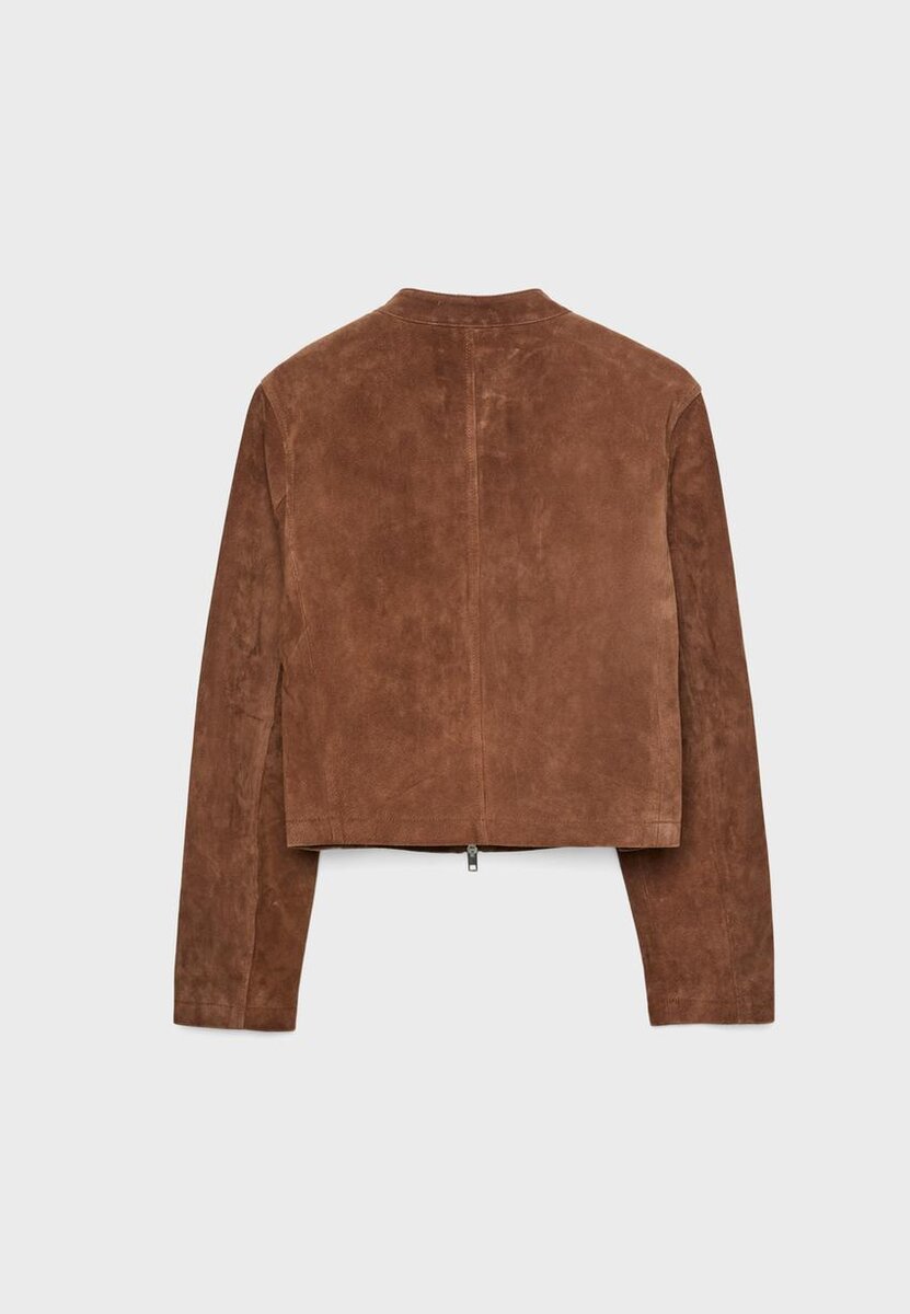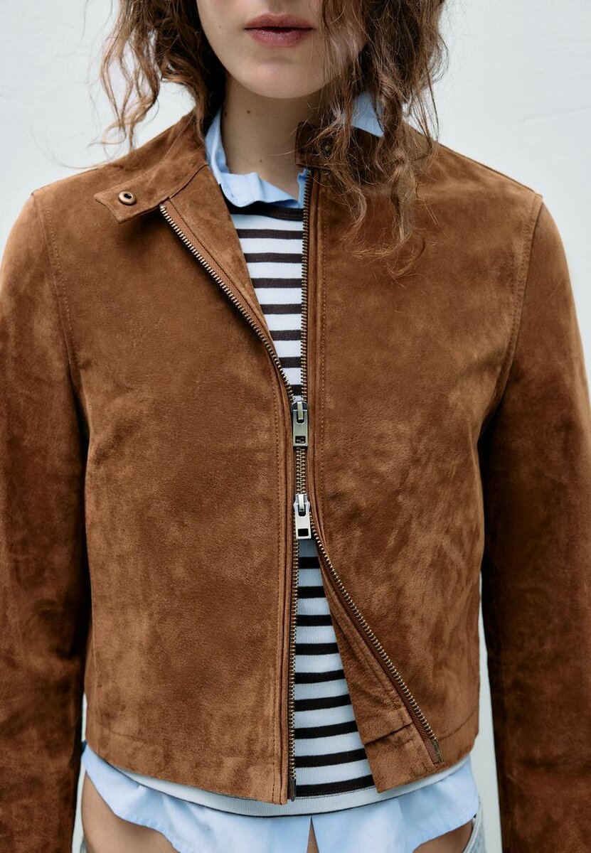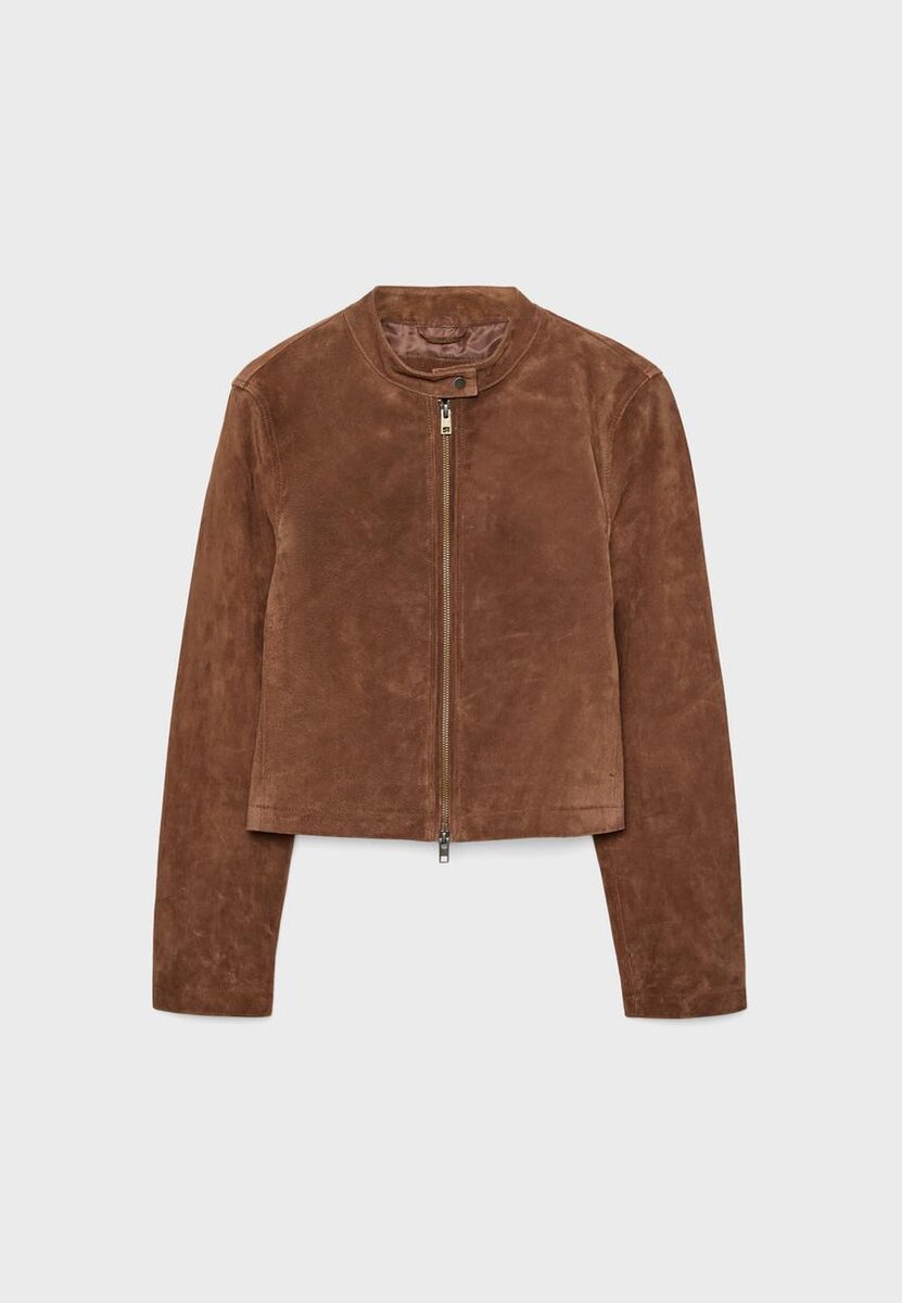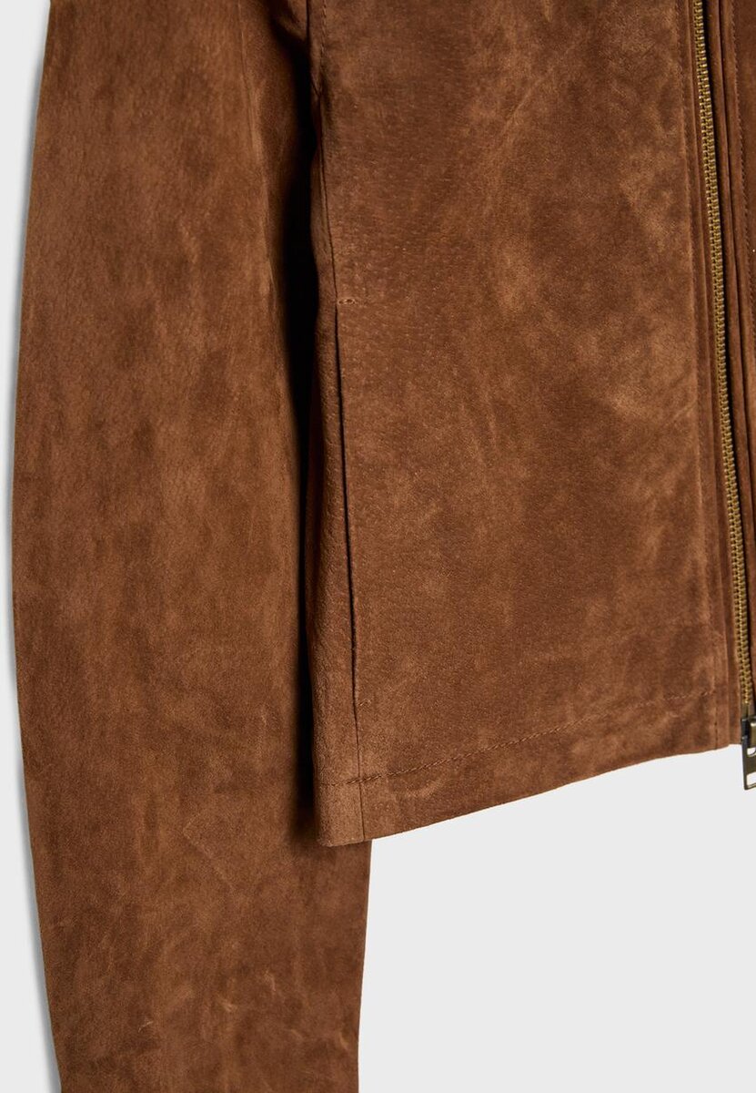 Veste courte en cuir de porc 100 % avec doublure en polyester. Col montant avec bouton et manches longues. Poches latérales. Fermeture à l’avant par fermeture éclair double sens.