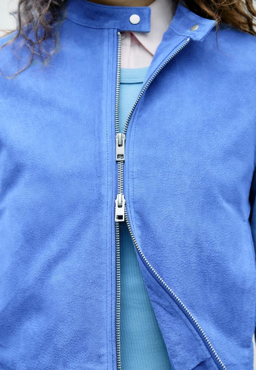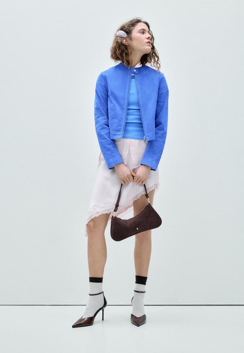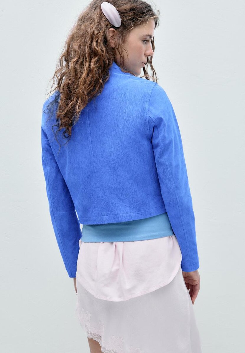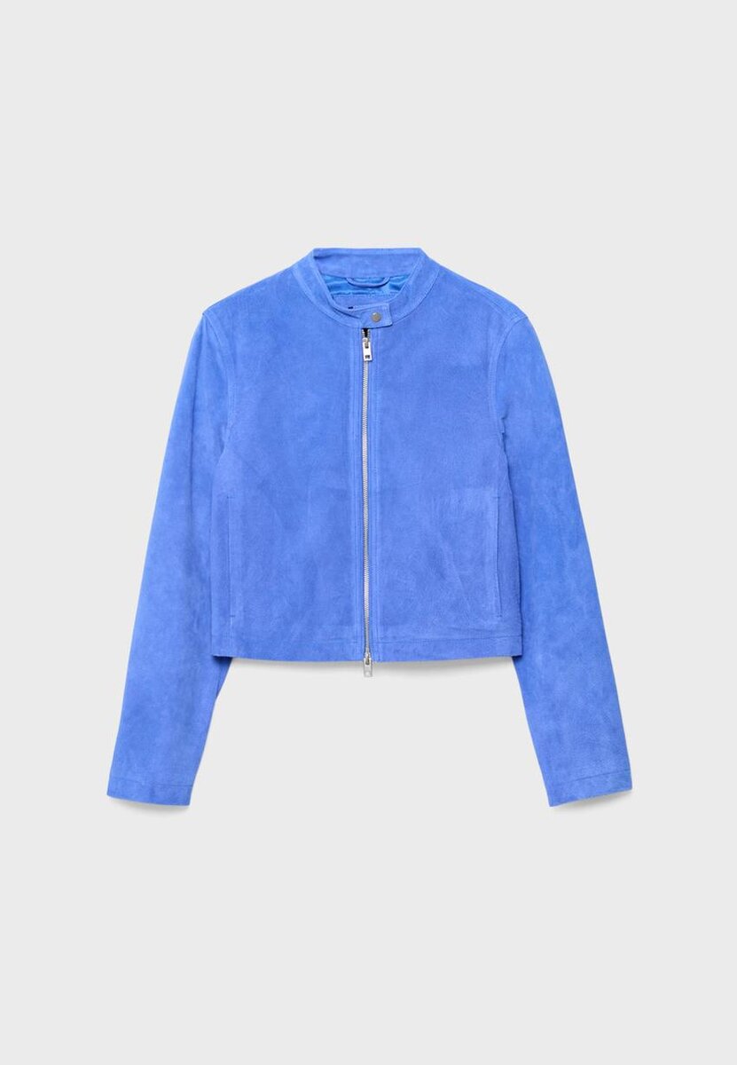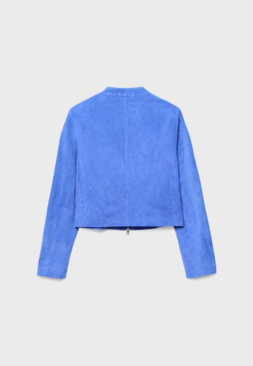 Veste courte confectionnée dans un tissu principal en cuir de porc et une doublure en polyester. Col montant avec bouton et manches longues. Poches latérales. Fermeture éclair double sens sur le devant.