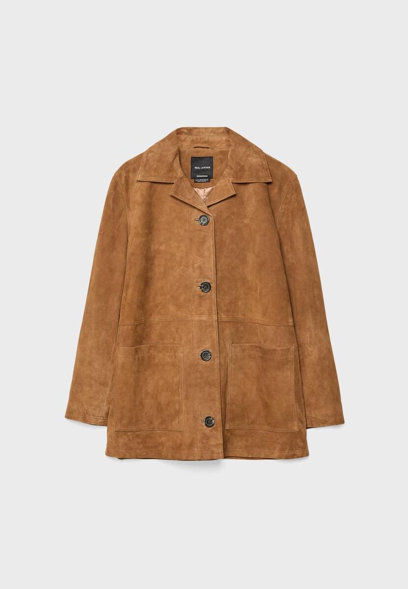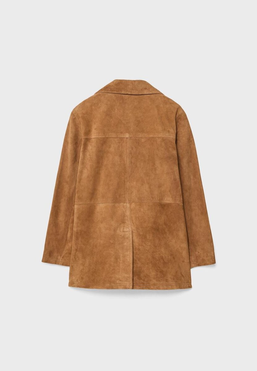 Veste en cuir. Col à revers et manches longues. Poches plaquées sur le devant. Fermeture à l’avant avec boutons contrastés.
