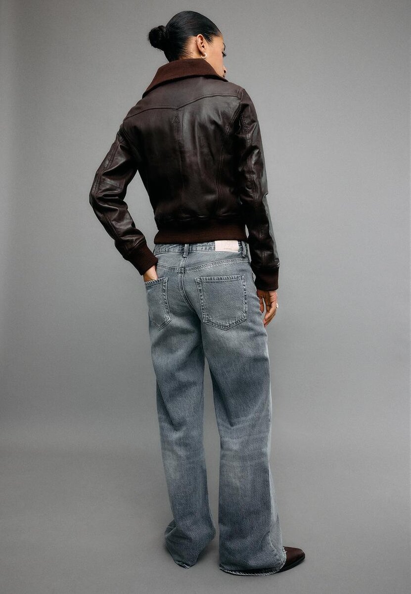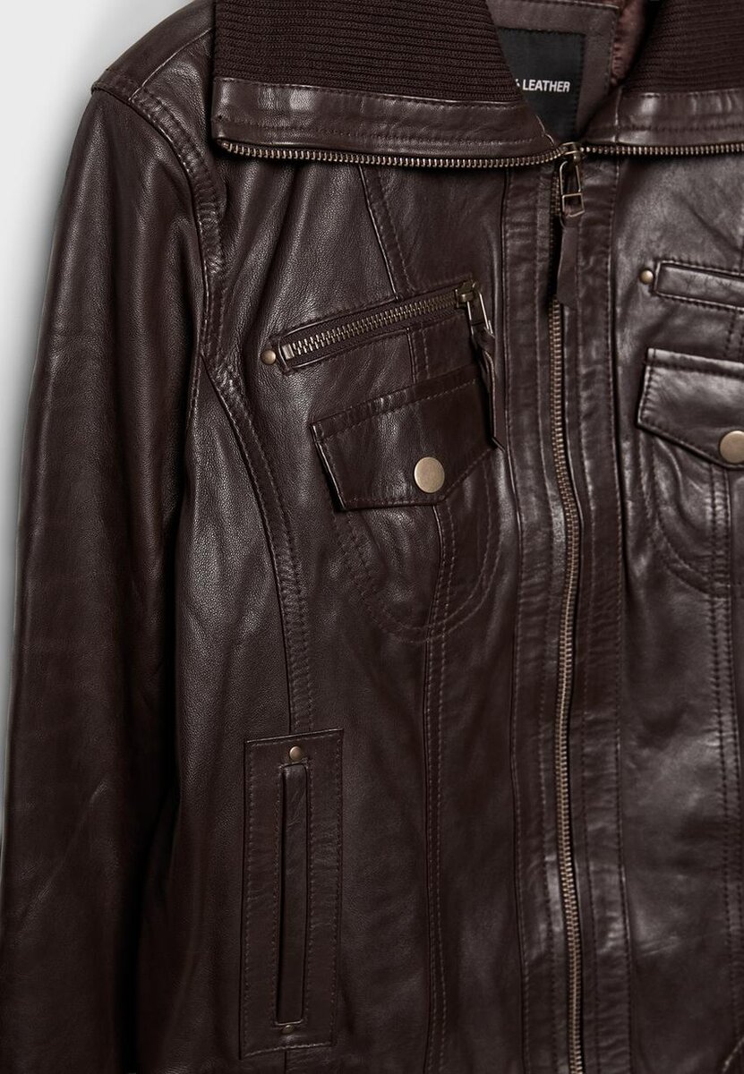 Veste en cuir. Col à revers et manches longues avec poignets élastiques. Poches passepoilées sur les côtés et multiples poches avec fermetures éclair et boutons sur la poitrine. Bordure en tricot côtelé dans un ton assorti. Fermeture à l’avant avec fermeture éclair métallique.