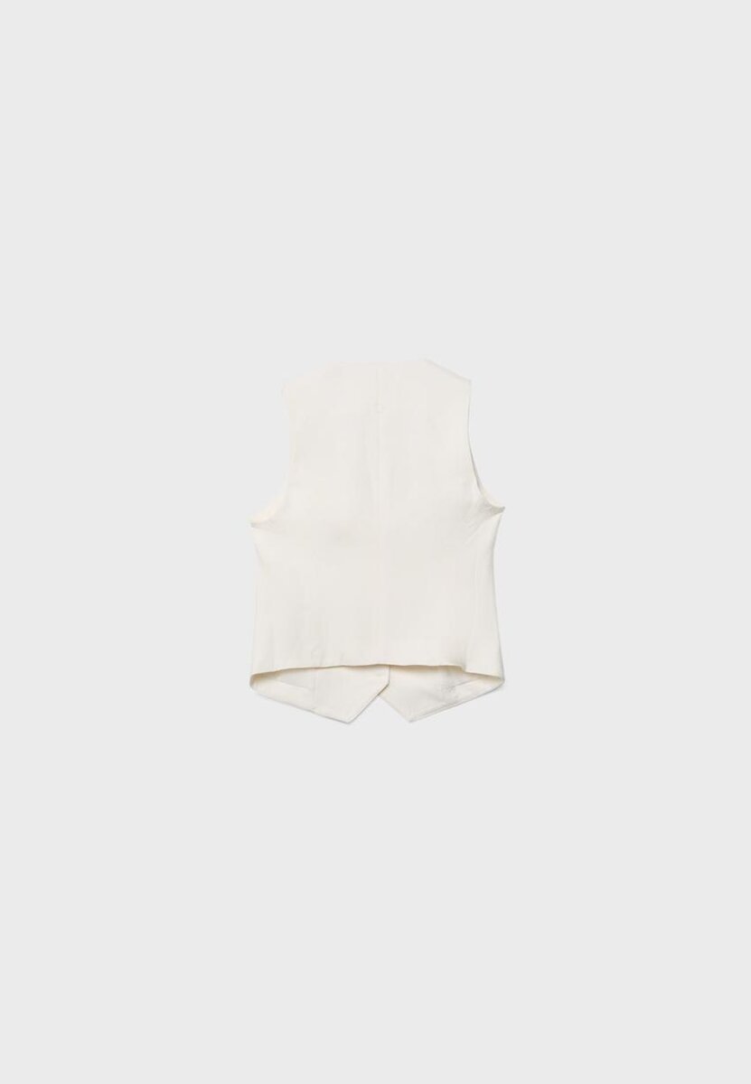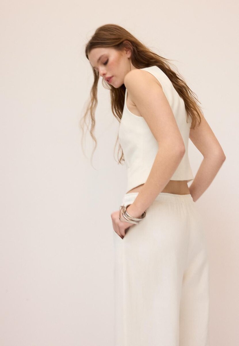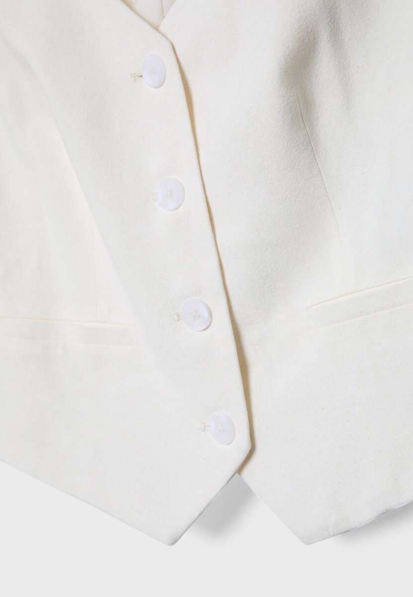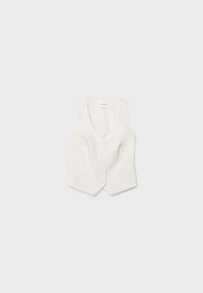 Gilet court à col en V et sans manches, confectionné dans un tissu contenant 20 % de lin. Doté de fausses poches passepoilées sur le devant et d’une fermeture à boutons sur le devant.