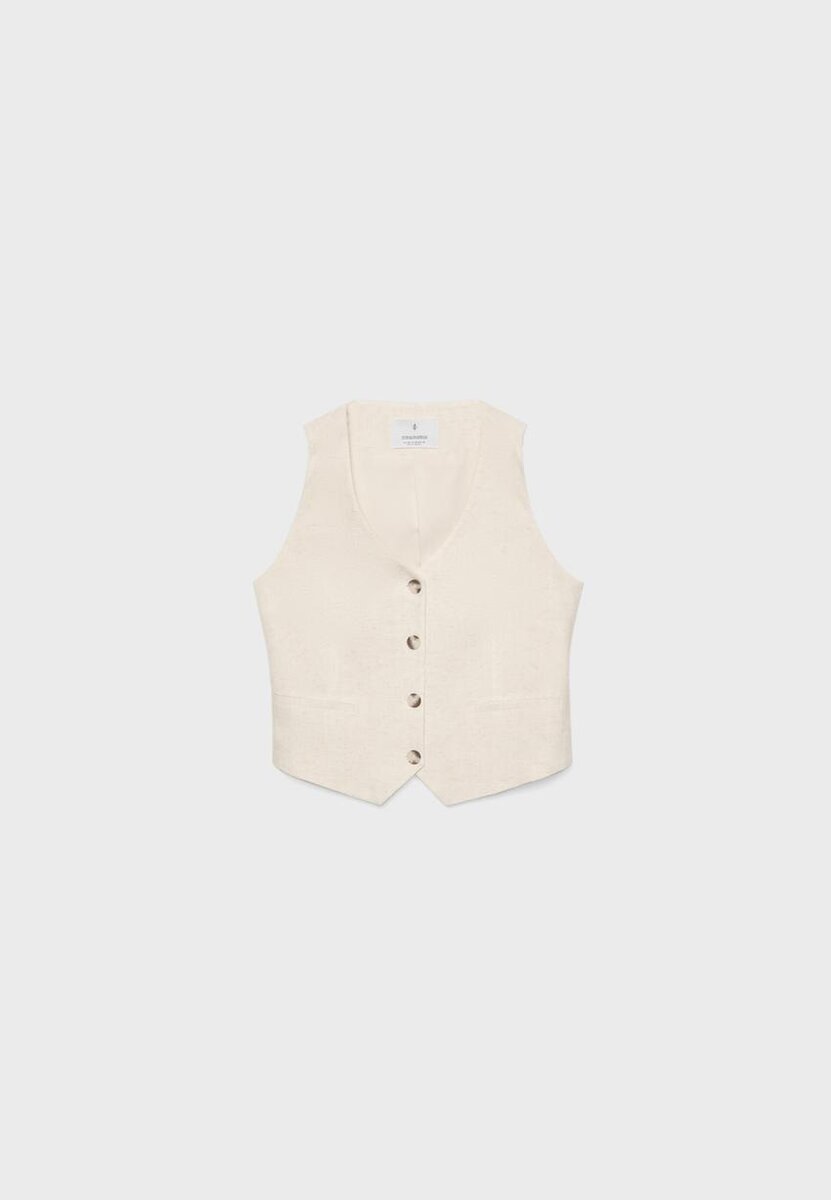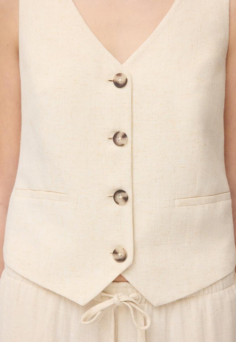 Gilet confectionné dans un tissu effet lin. Col en V, fausses poches passepoilées sur le devant et fermeture à boutons sur le devant.